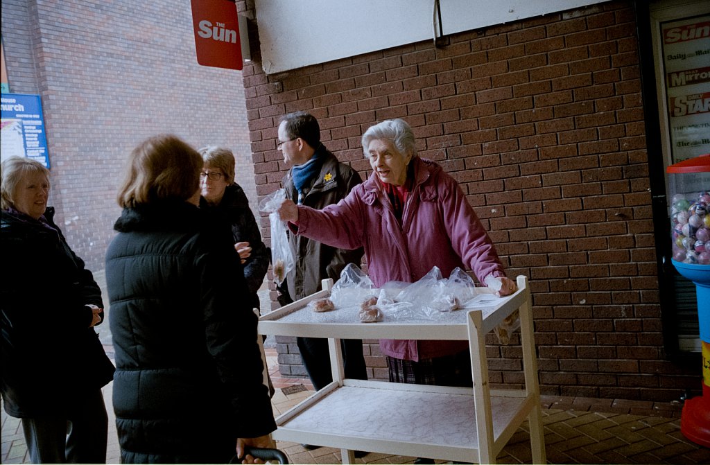 © Si Barber 07739 472 922 Members and friends of Mansfield Unitarian Church handing out hot cross buns on Good Friday 2015 to shoppers in the Four Seasons shopping centre, continuing the tradition of the Mary Mallatratt Dole. The 'dole' was started in 1894 when the Mansfield left monies to provide 48 hot cross buns to the children of the town.