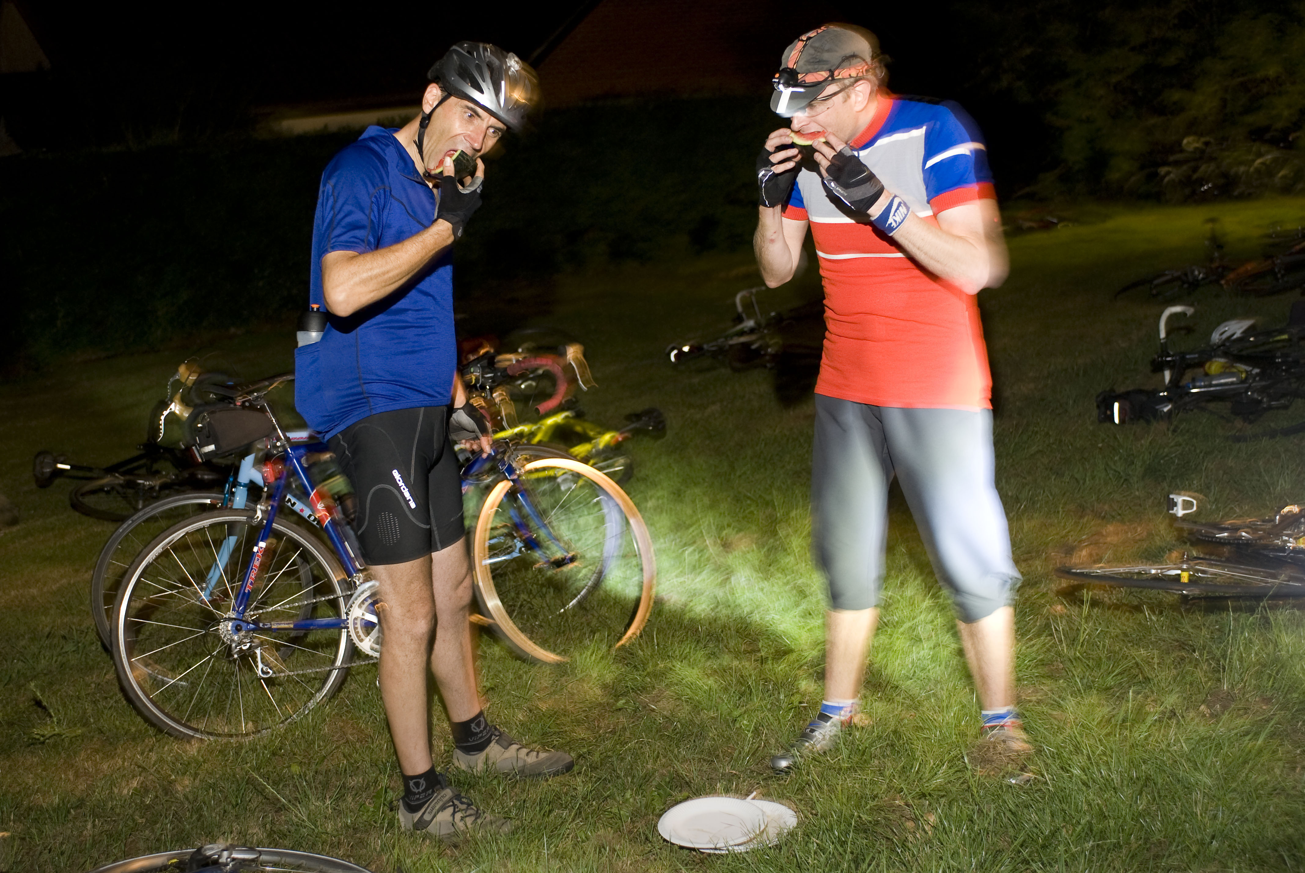 Si Barber 07739 472 922 Ordered by Leila Rawlins The Dunwich Dynamo cycle race in which competitors ride 120 mile route from London Fields to Dunwich in Suffolk overnight. Picture shows riders taking a break to take on some food.