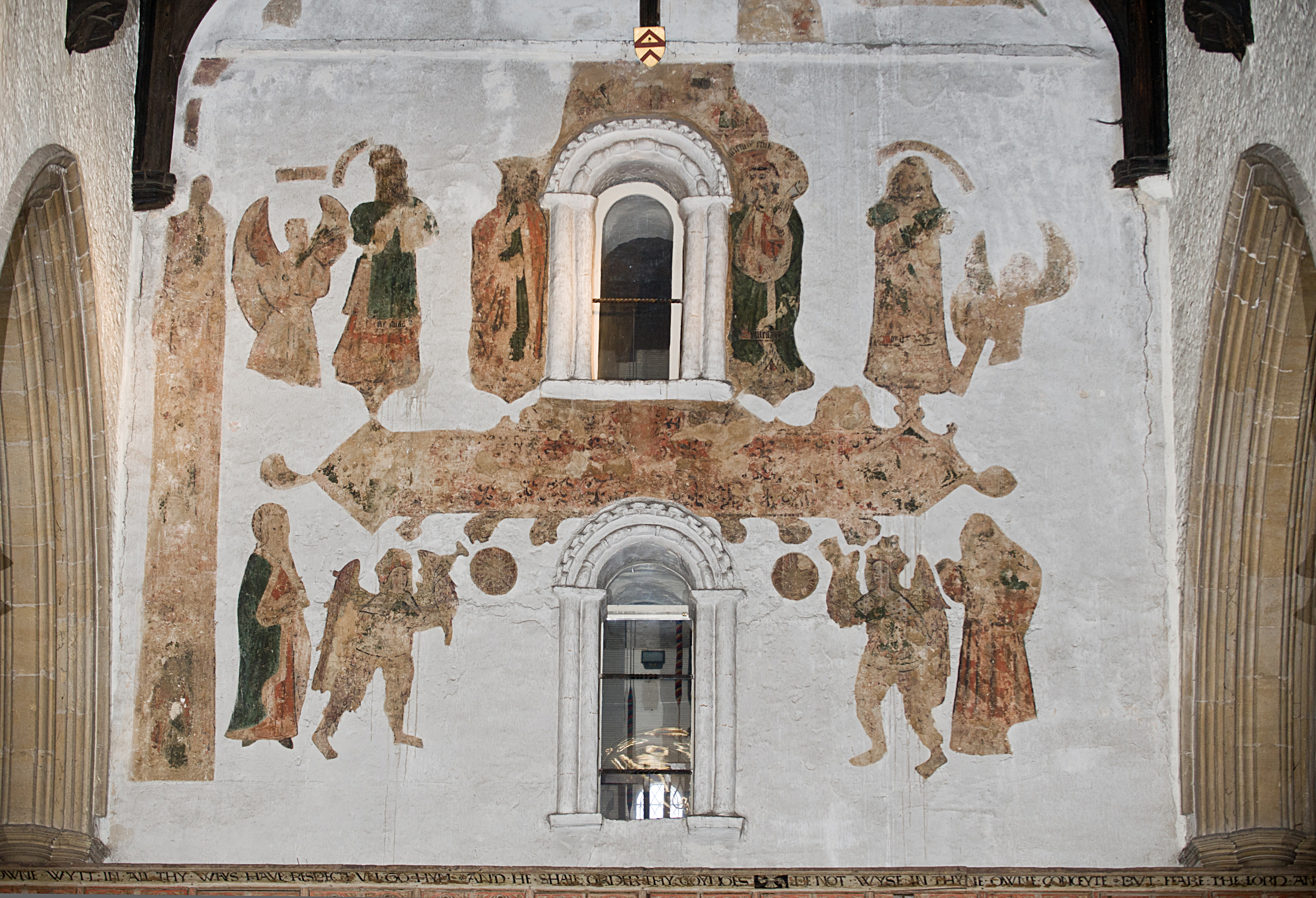 The rood screen and detail at St Mary's Church, Attleborough, Norfolk,UK. From the North (left) side, St John the Baptist , St John the Evangelist , the Blessed Virgin and Child. On the South side St Thomas of Canterbury, the Holy Trinity, and St Bartholomew. The church features a wall painting of the annunciation.