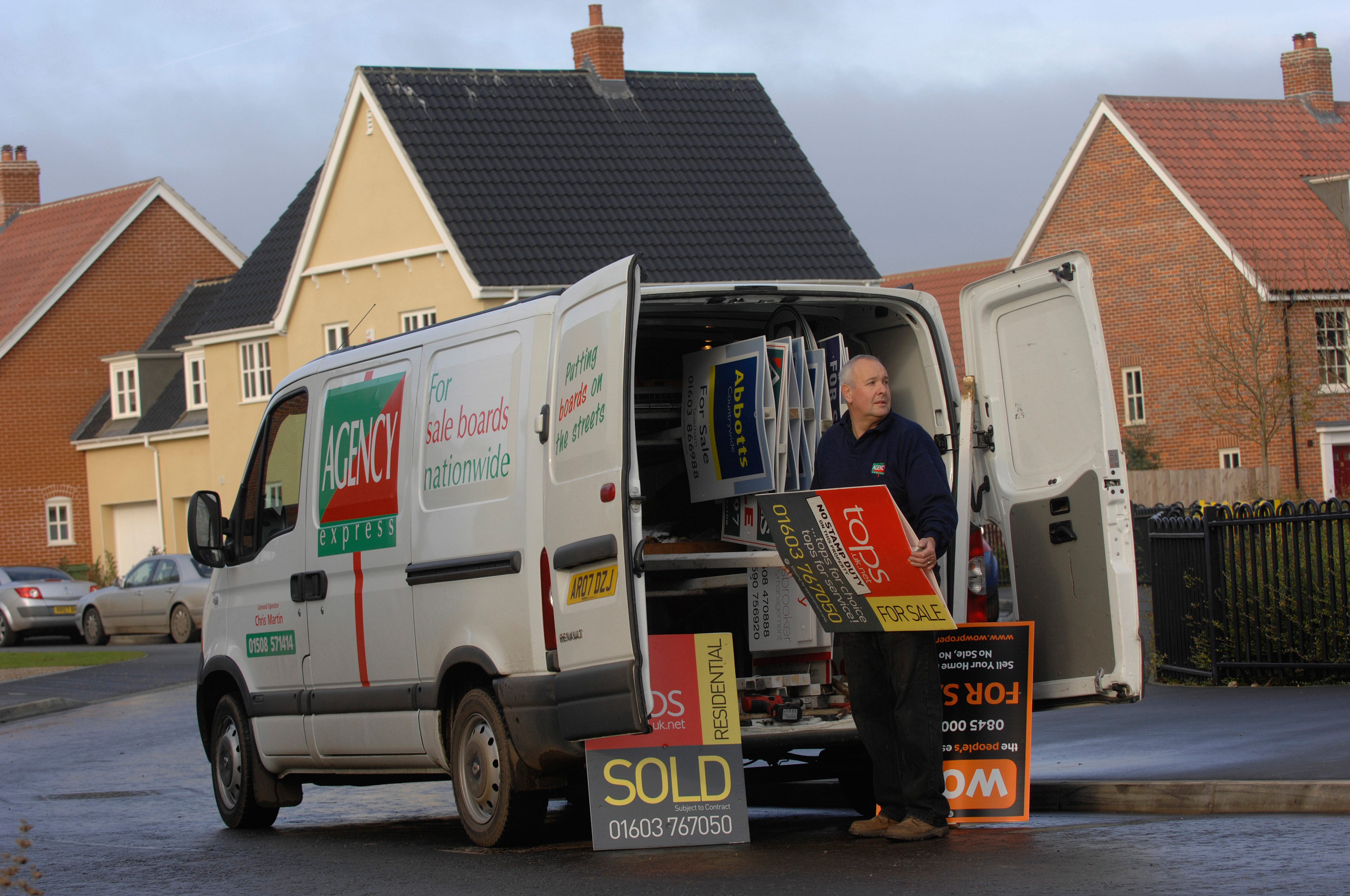 ©Si Barber/07739 472 922 A sign erector puts up for sale and sold signs on behalf of estate agents on a housing estate in the UK