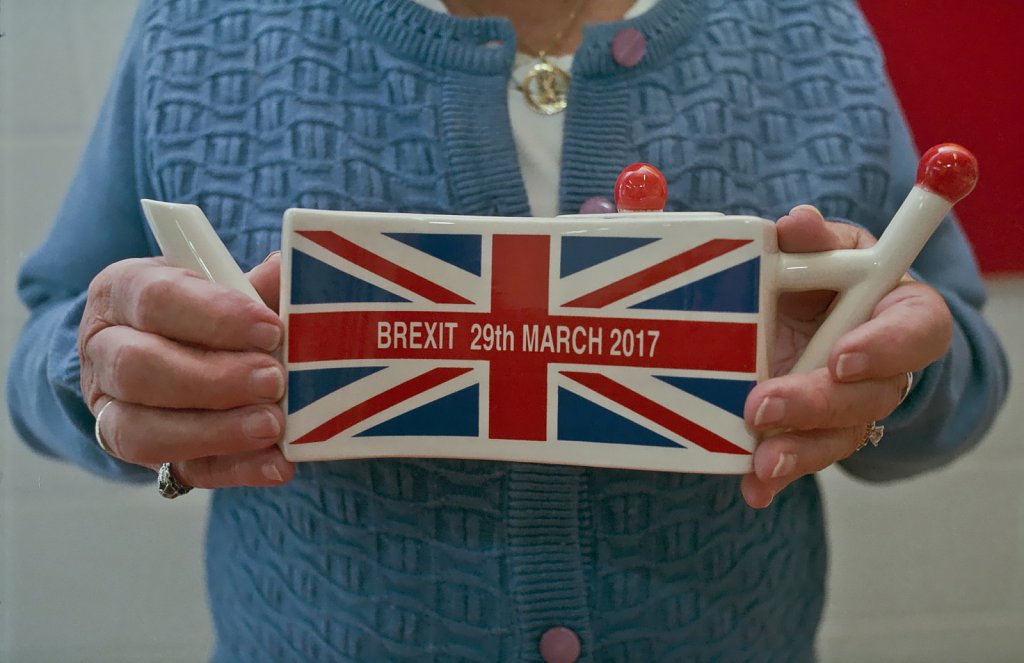 A woman holding a teapot celebrating the signing the signing of Article 50 which will withdraw Britain from the EU.