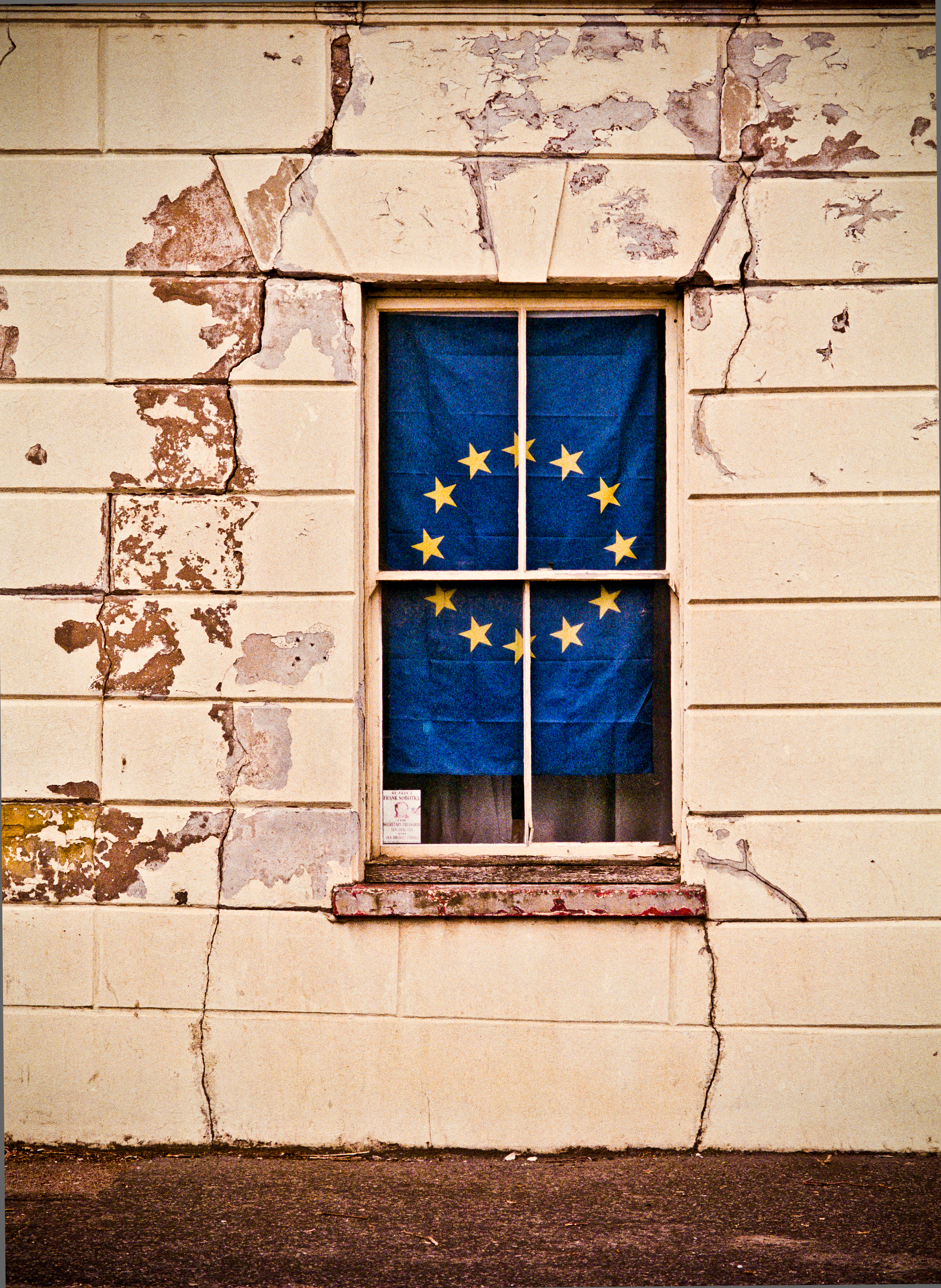 An EU flag hangs in the window of a dilapdated building in King’s Lynn, Norfolk, UK