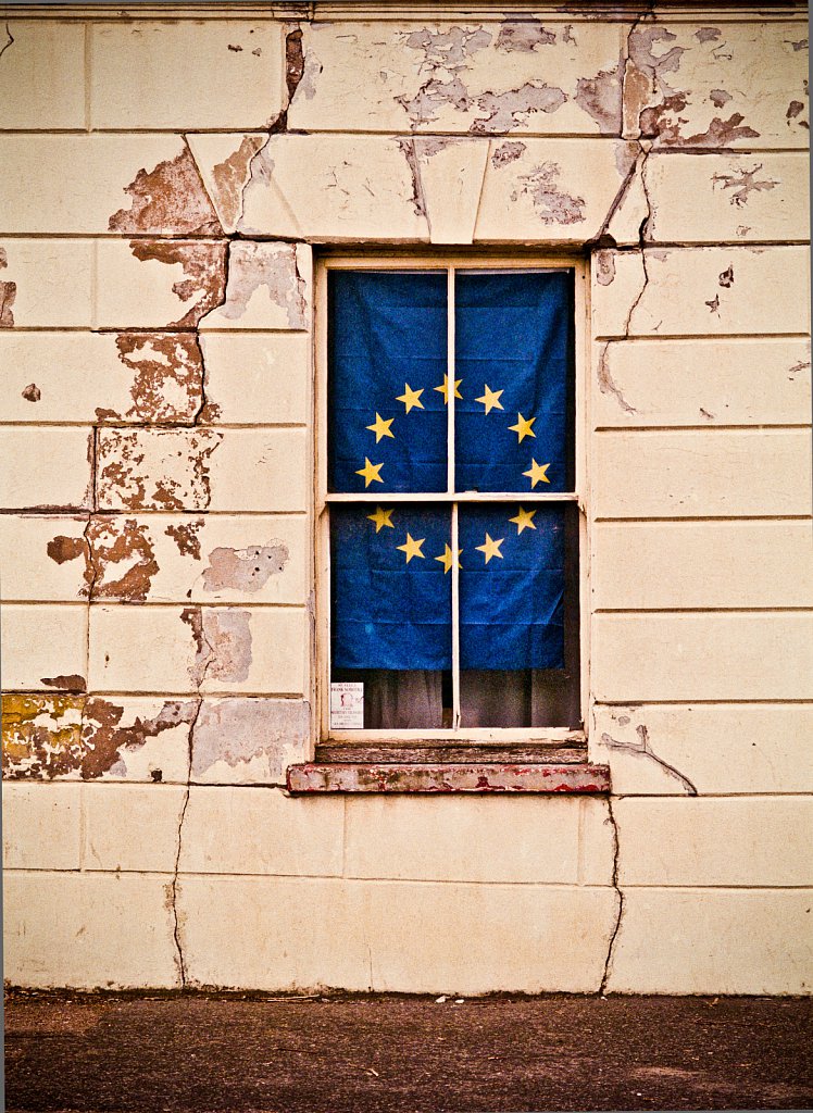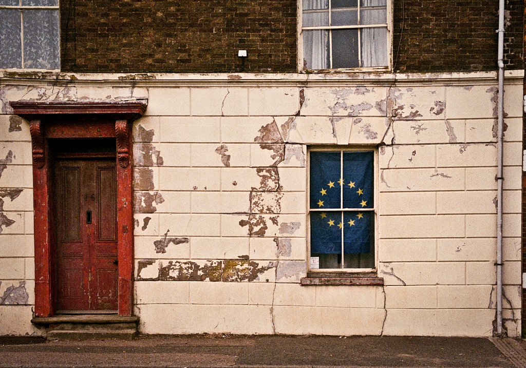 brexit building dilapidated dilapidation eu european flag hangs kings lynn leave norfolk uk union window