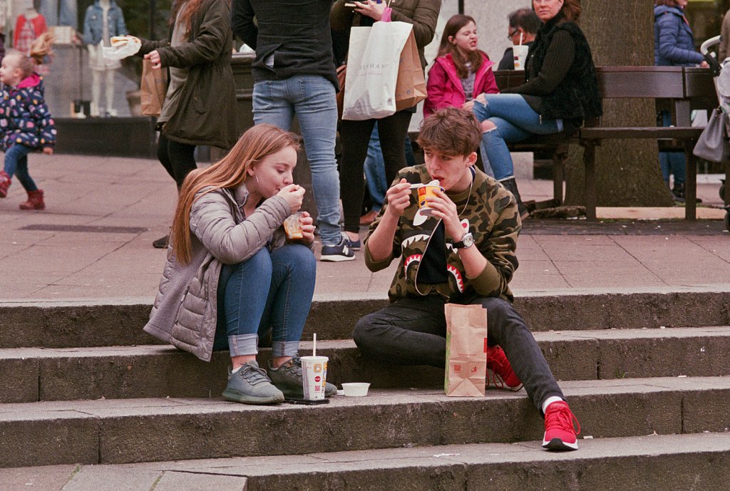 A young couple eating McDonald's in Norwich,UK.