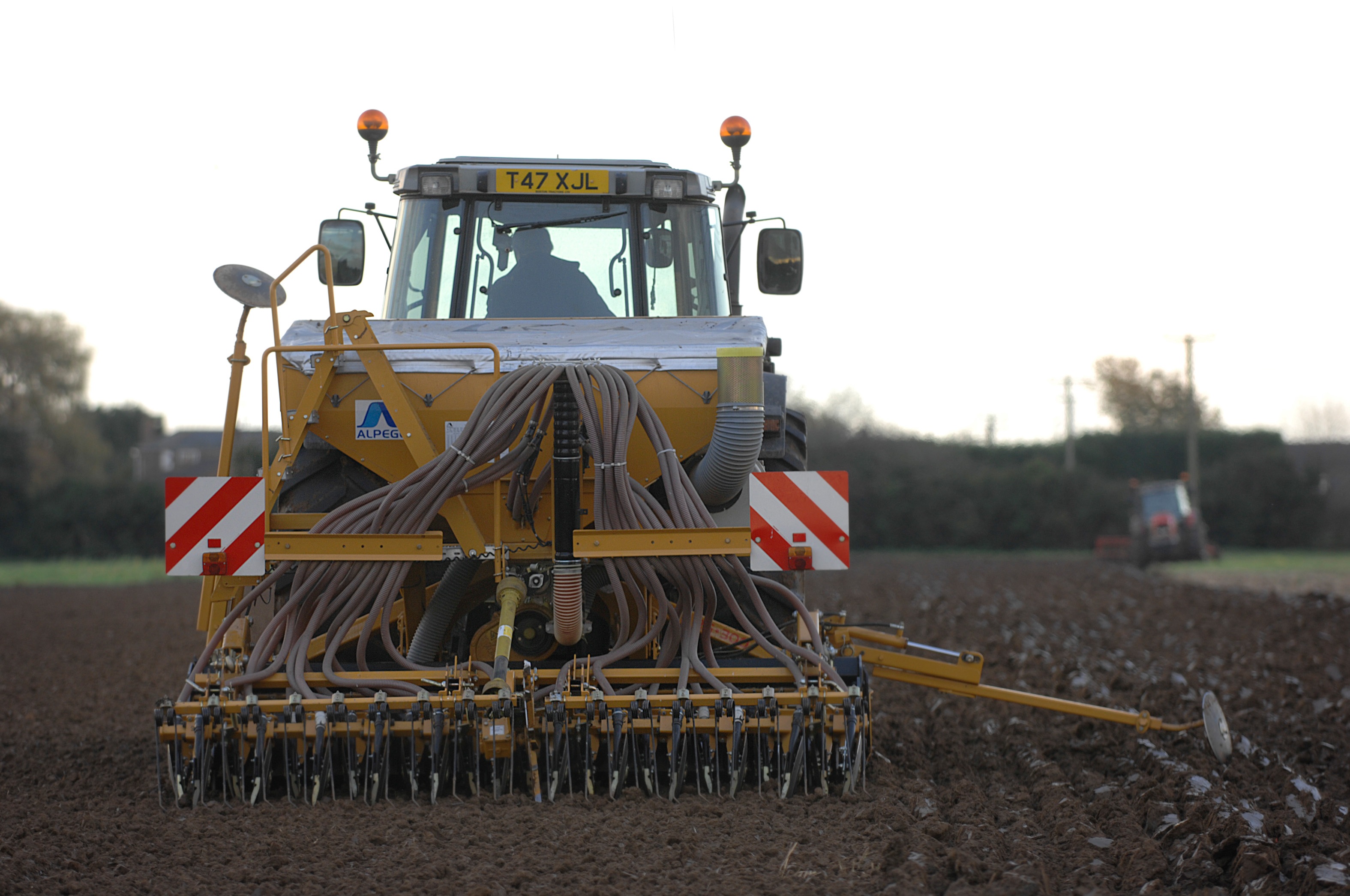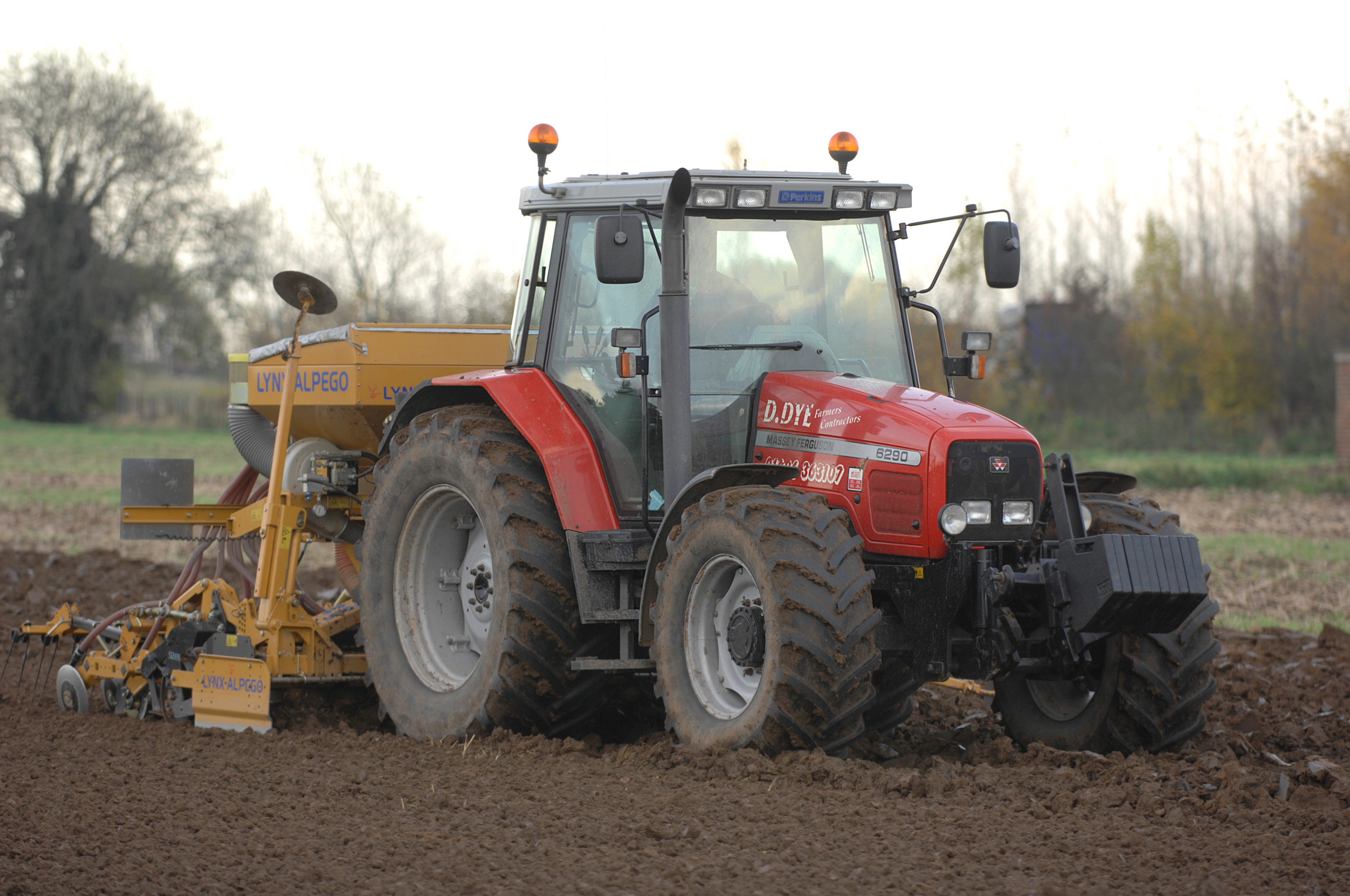 A Massey Ferguson 6290 sowing winter wheat using a Lynx Alpego seed driil .