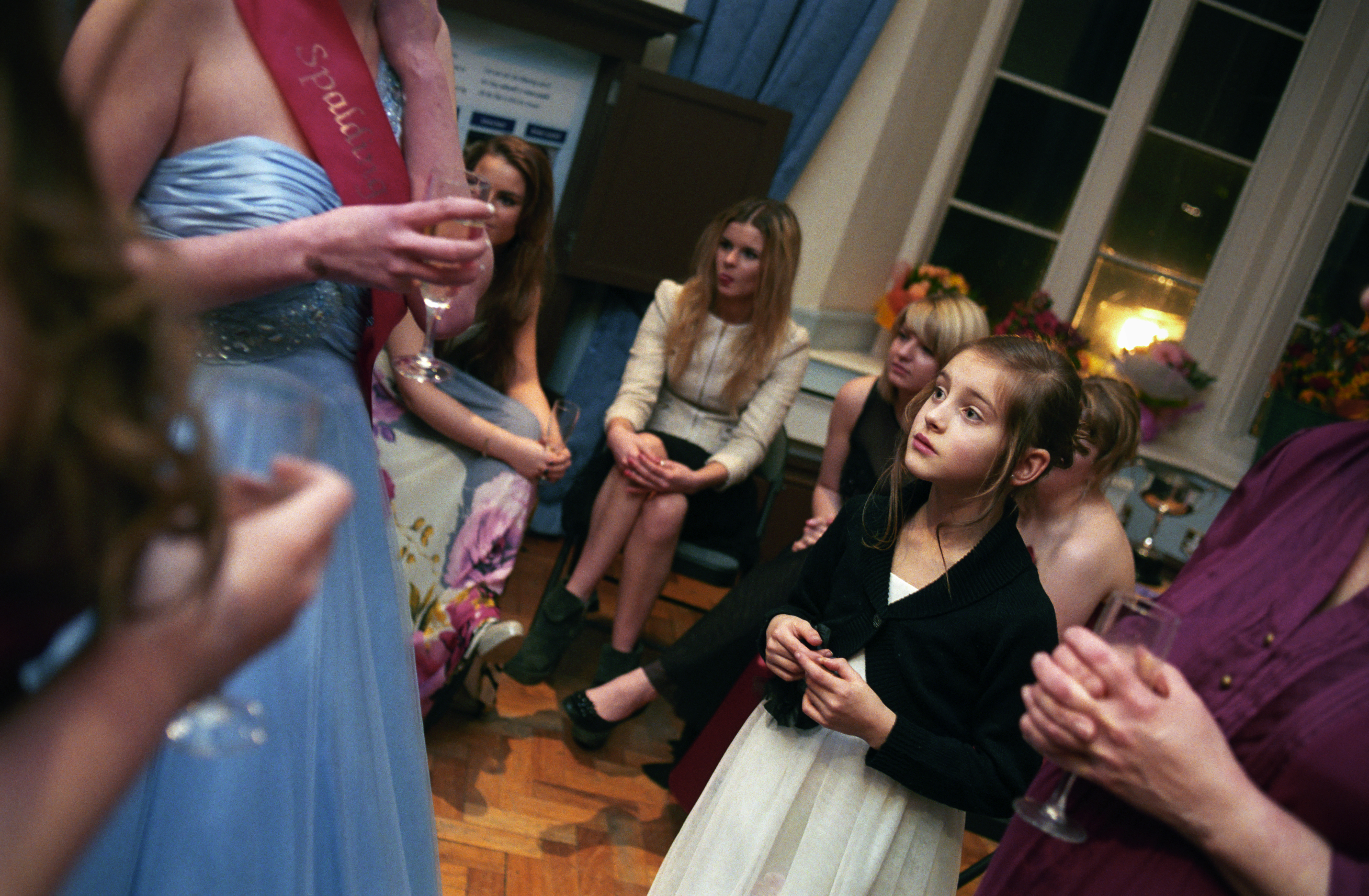 ©Si Barber. Moral rights asserted.   9 year old Millie Weller, Flower Princess admires the finalists' dresses as they wait for the judges decision... .. The Spalding Flower Queen is a decades old contest in which the young women of Spalding, Lincs, UK compete for the title of Queen which entitles them to head the The Spalding Flower Parade. Due to austerity and recession the parade will come out for the last time in 2013. Please contact me for the full text or go here http://sibarberphotographer.blogspot.co.uk/2013/03/farewell-to-flower-queen.html