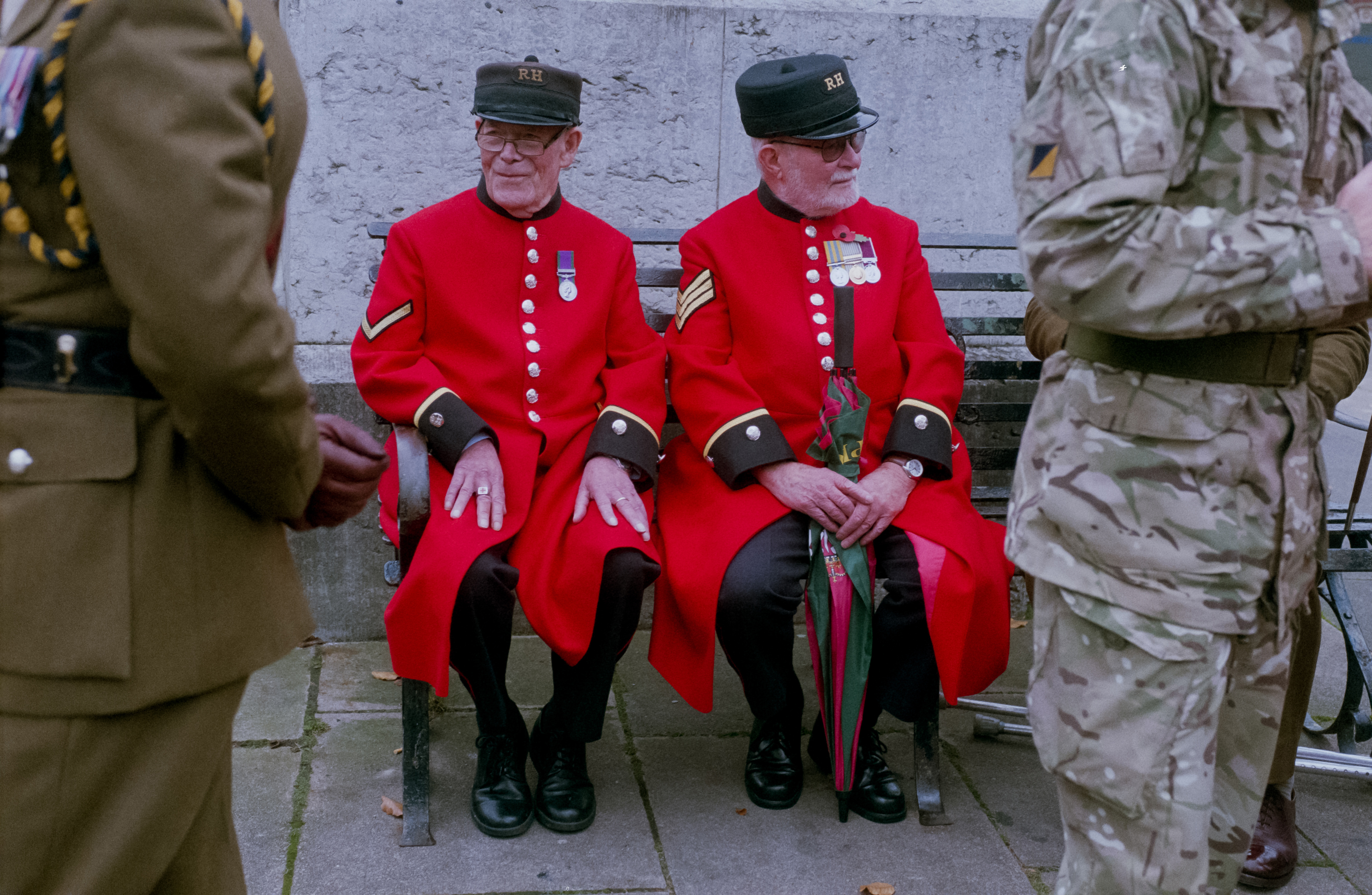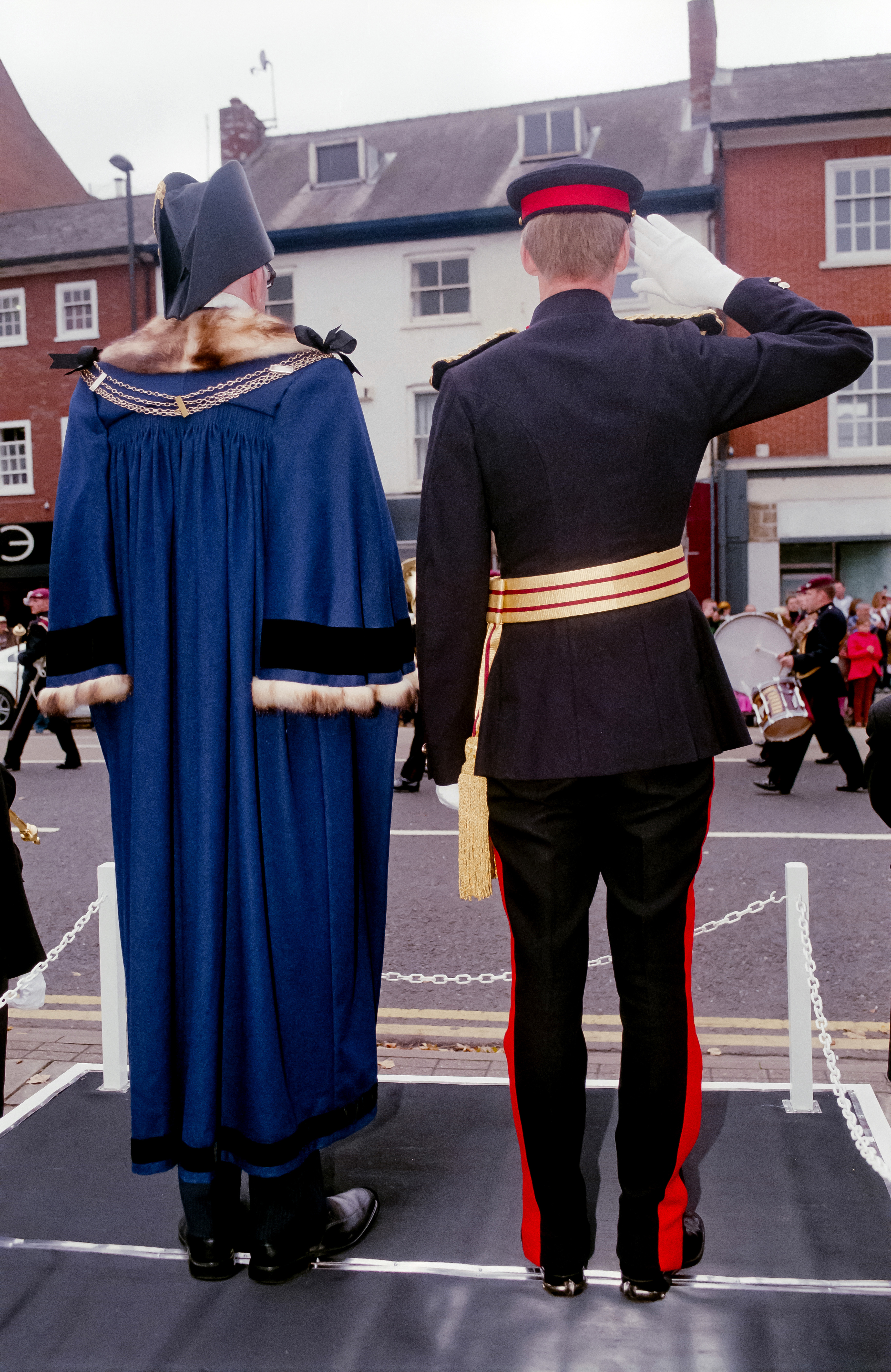 Chelsea pensioners and civic dignitaries by Grantham war memorial 2014.