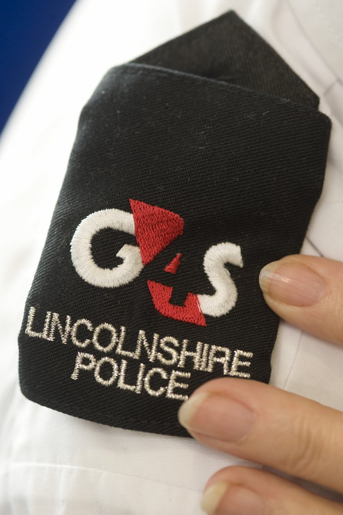 A police worker in Lincolnshire wearing an epaulette with the G4S logo. The public/private partnership, the first in the UK is thought to be a blueprint for other forces.
