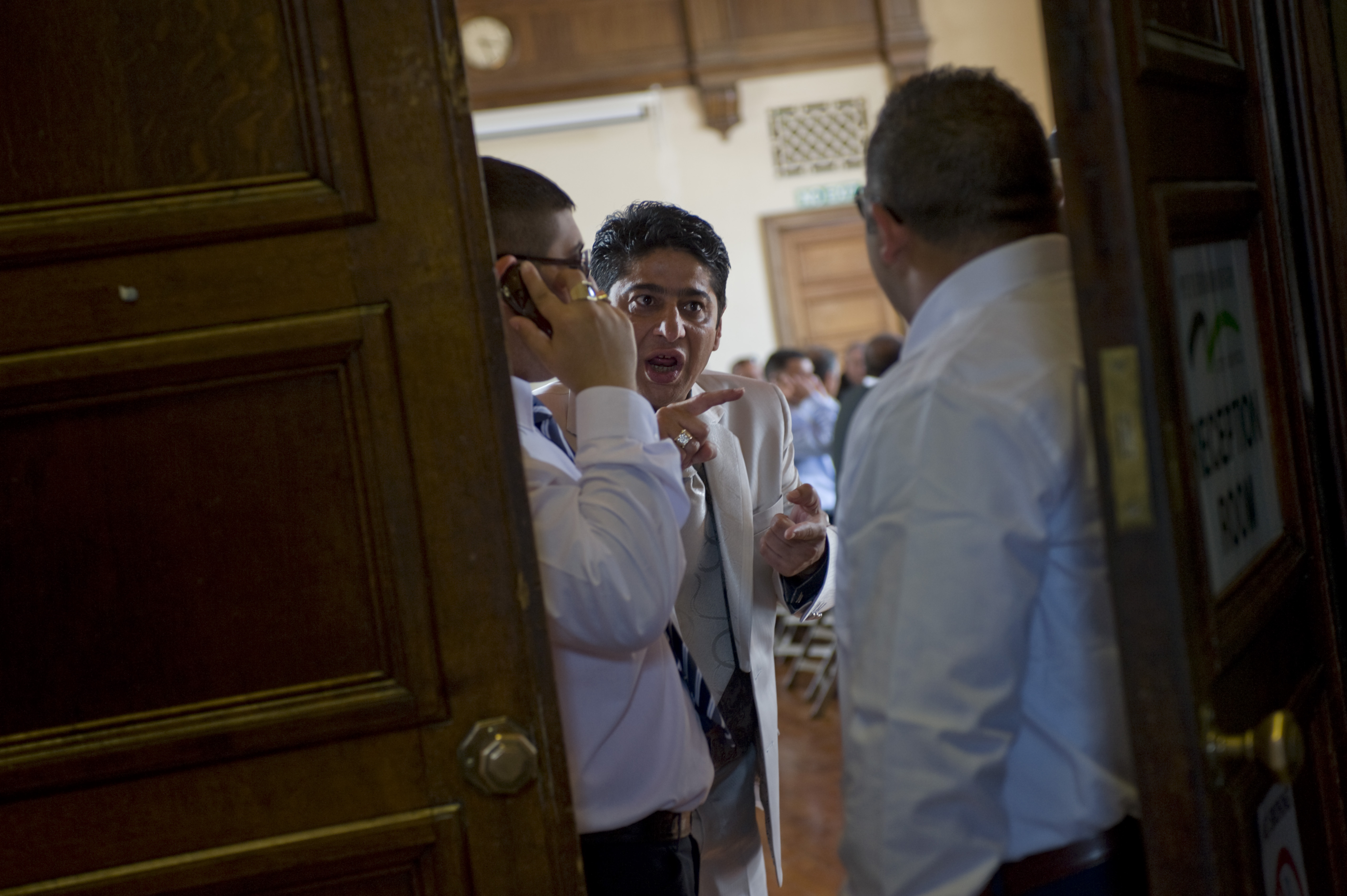 ?Si Barber2010 Tel 07739472922.Voting in the UK's first ever Roma Gypsy election gets under way in Peterborough, Cambridgeshire on Saturday 25th June 2011..Nineteen candidates from across Britain have been ?campaigning ?for the title of 'King of the Gypsies, which in past years was decided with a fist-fight but today the winner will be nominated by the ballot box. ?The victor will be awarded a crown and a 'gold' stick which will empower them to adjudicate on disputes within the community. In this picture?views are exchanged with election officials before the counting starts..