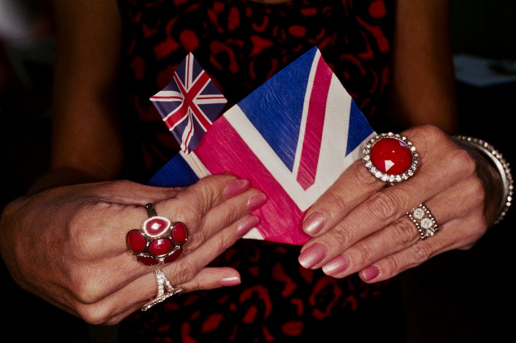 A woman holding a union jack serviette at celebrations for the wedding of Prince Harry and Meghan Markle.