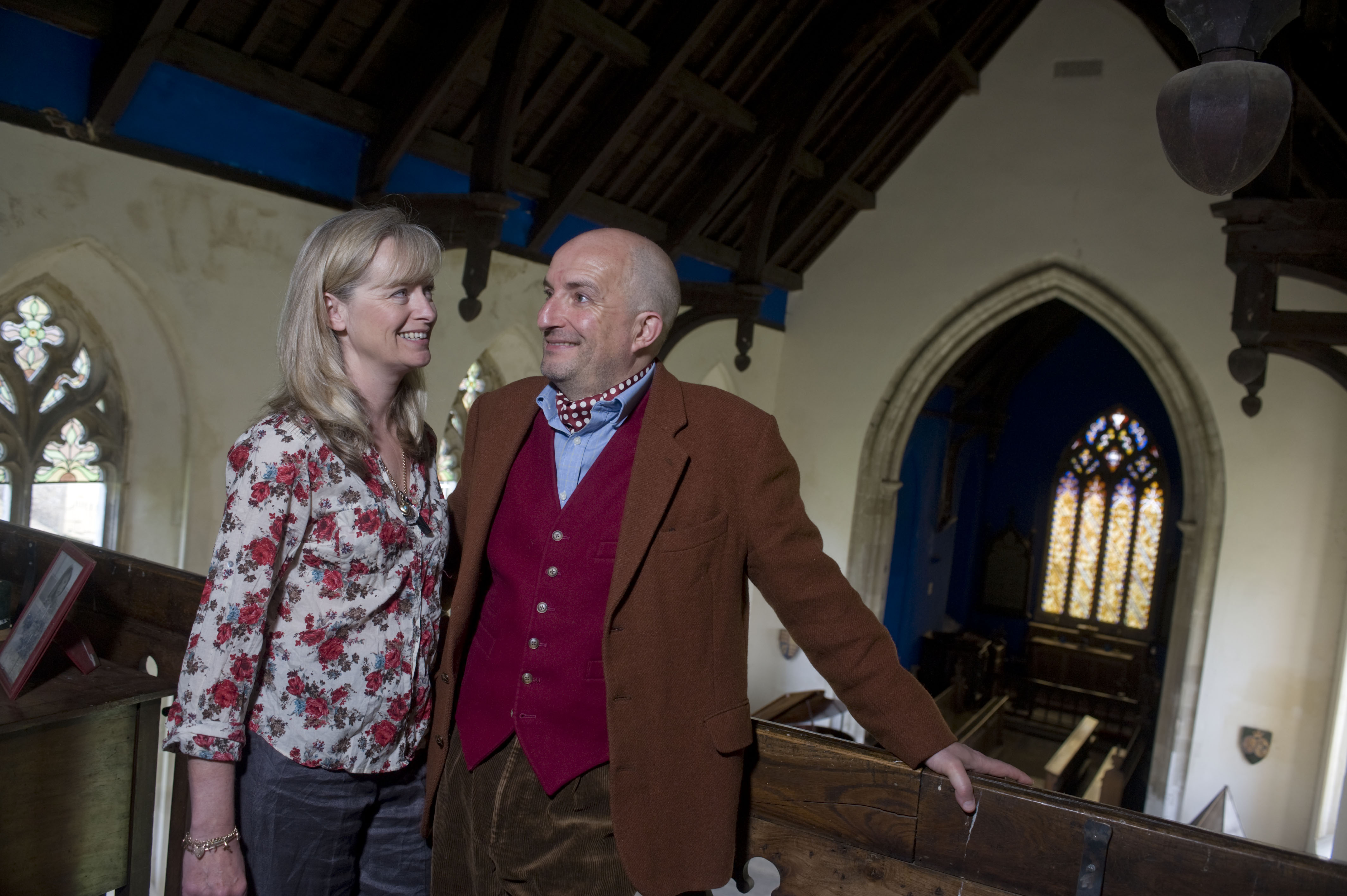 Kit and Kate Hesketh Harvey with their church in Stoke Ferry, Norfolk.