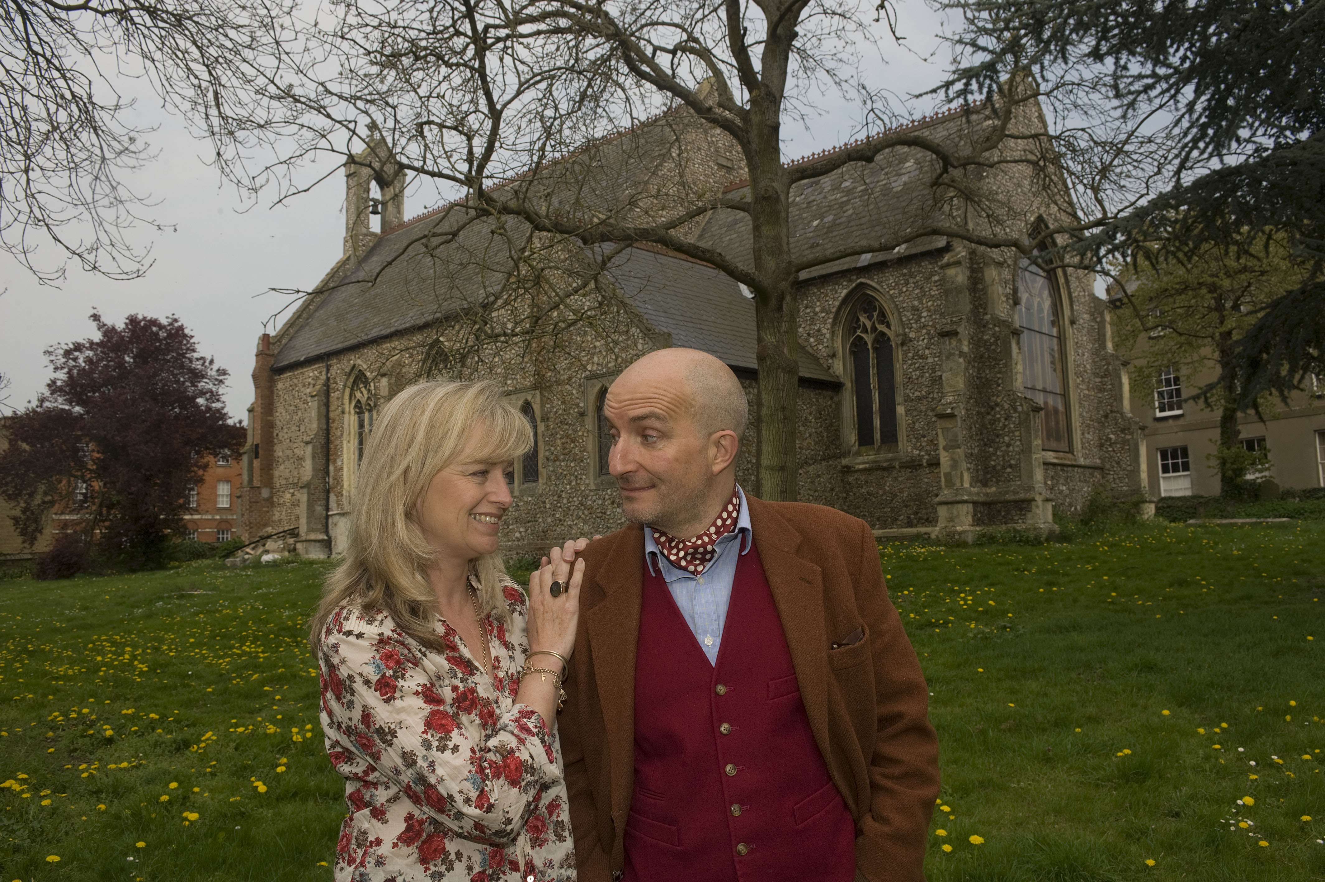 Kit and Kate Hesketh Harvey with their church in Stoke Ferry, Norfolk.