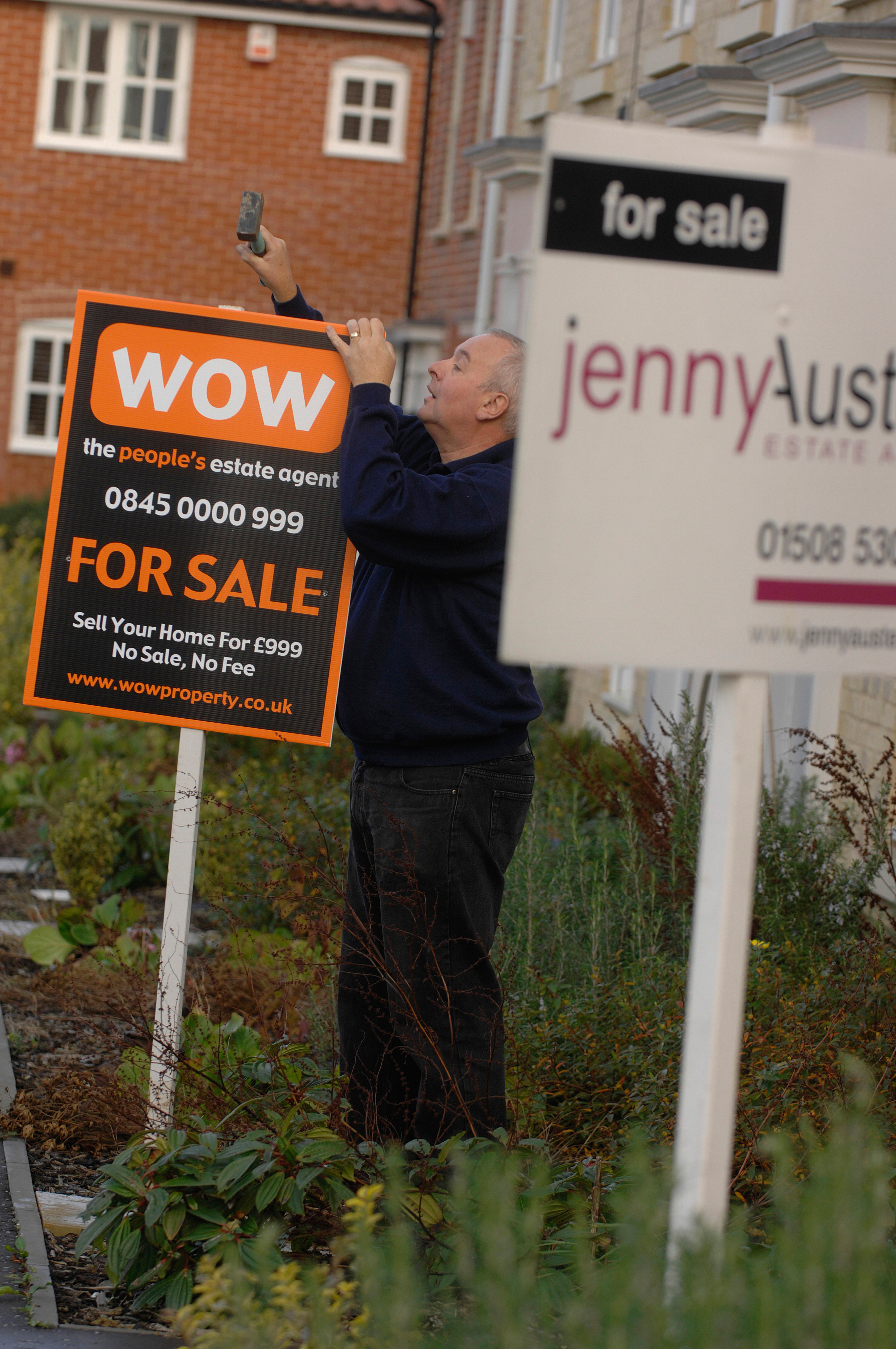 ©Si Barber/07739 472 922 A sign erector puts up for sale and sold signs on behalf of estate agents on a housing estate in the UK