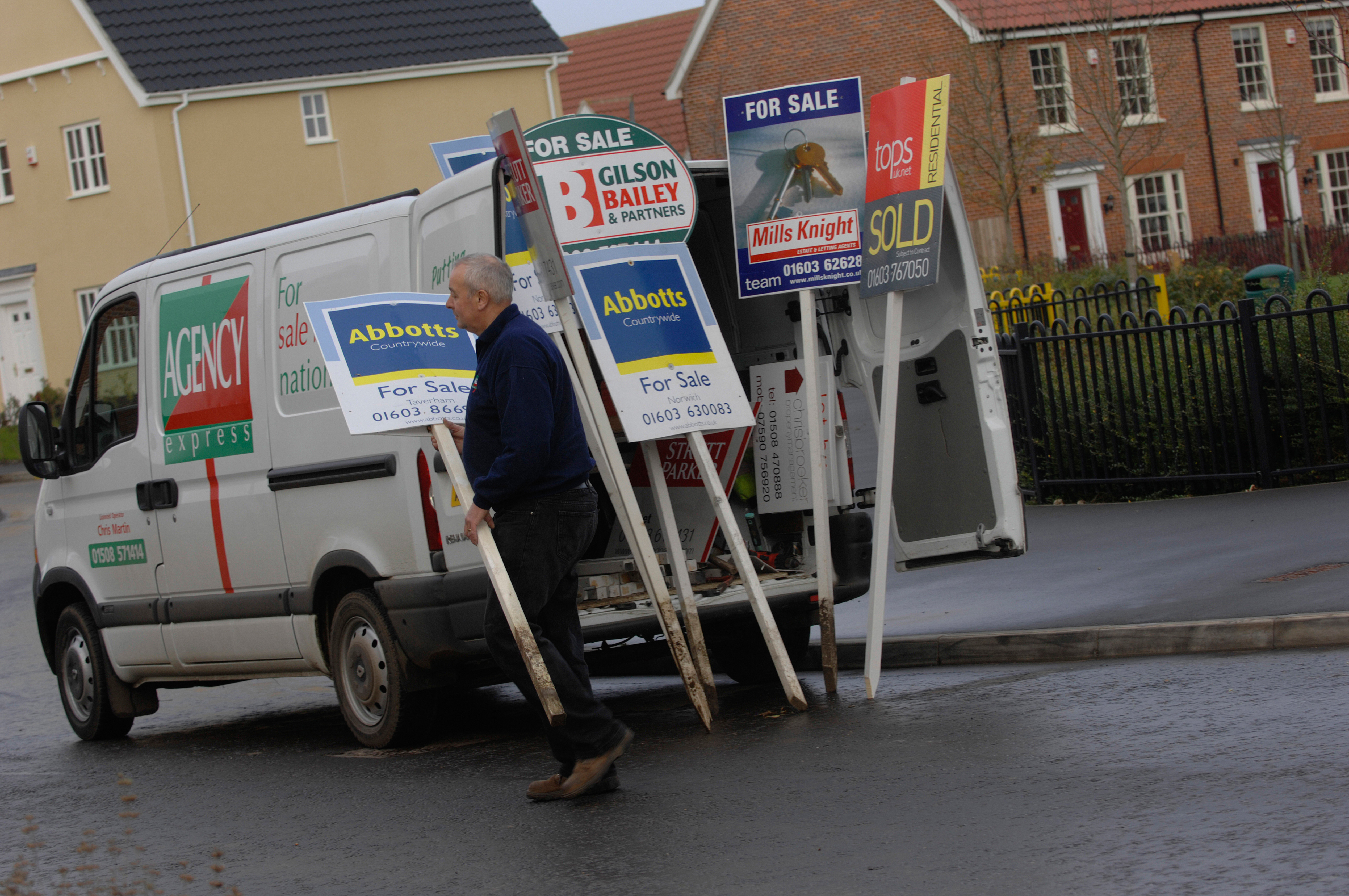 ©Si Barber/07739 472 922 A sign erector puts up for sale and sold signs on behalf of estate agents on a housing estate in the UK