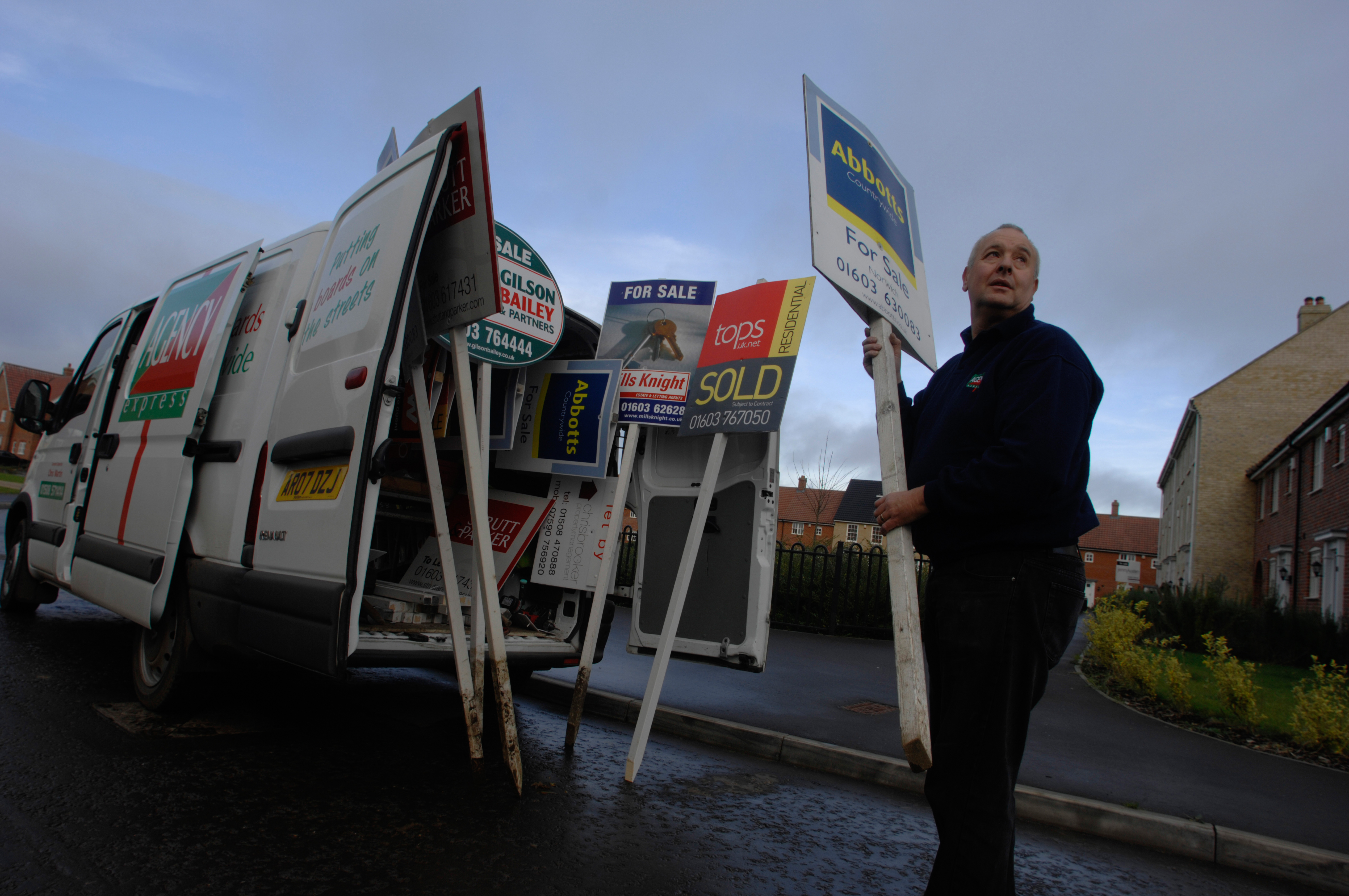 ©Si Barber/07739 472 922 A sign erector puts up for sale and sold signs on behalf of estate agents on a housing estate in the UK