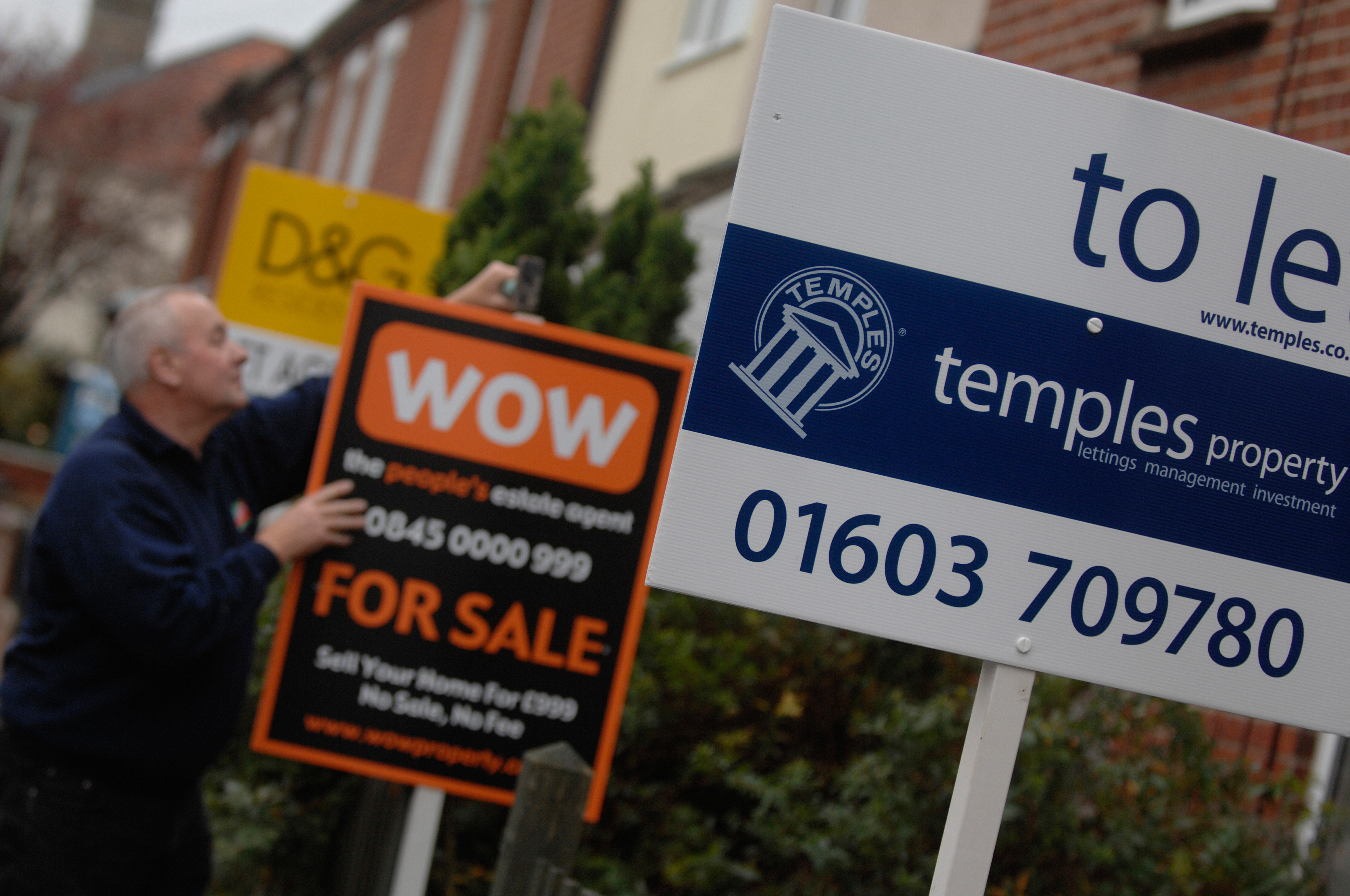 ©Si Barber/07739 472 922 A sign erector puts up for sale and sold signs on behalf of estate agents on a housing estate in the UK