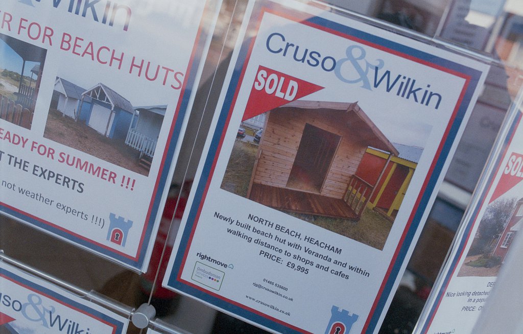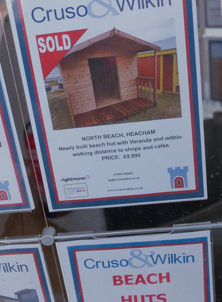 A beach hut advertised in an estate agent's window, Hunstanton,UK.