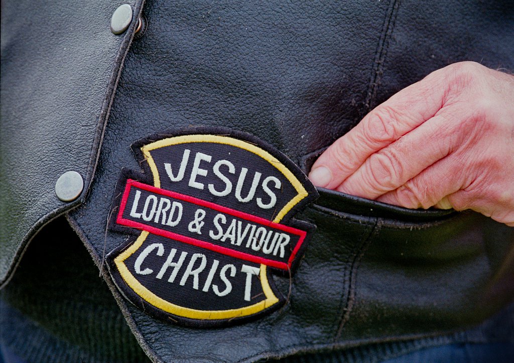 A biker wearing a patching declaiming his christianity, Wells Next The Sea, Norfolk.