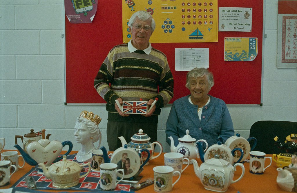 Mr & Mrs Street showing the collection of chinaware at Soham carnival including a teapot ommemorating Article 50 the legislation which will bring about Brexit.