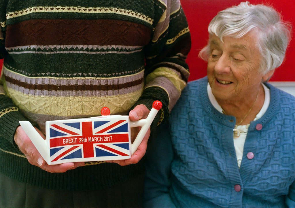 Mr & Mrs Street showing the collection of chinaware at Soham carnival including a teapot ommemorating Article 50 the legislation which will bring about Brexit.