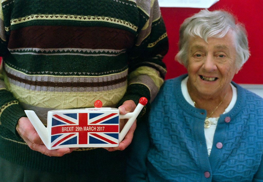 Mr & Mrs Street showing the collection of chinaware at Soham carnival including a teapot ommemorating Article 50 the legislation which will bring about Brexit.