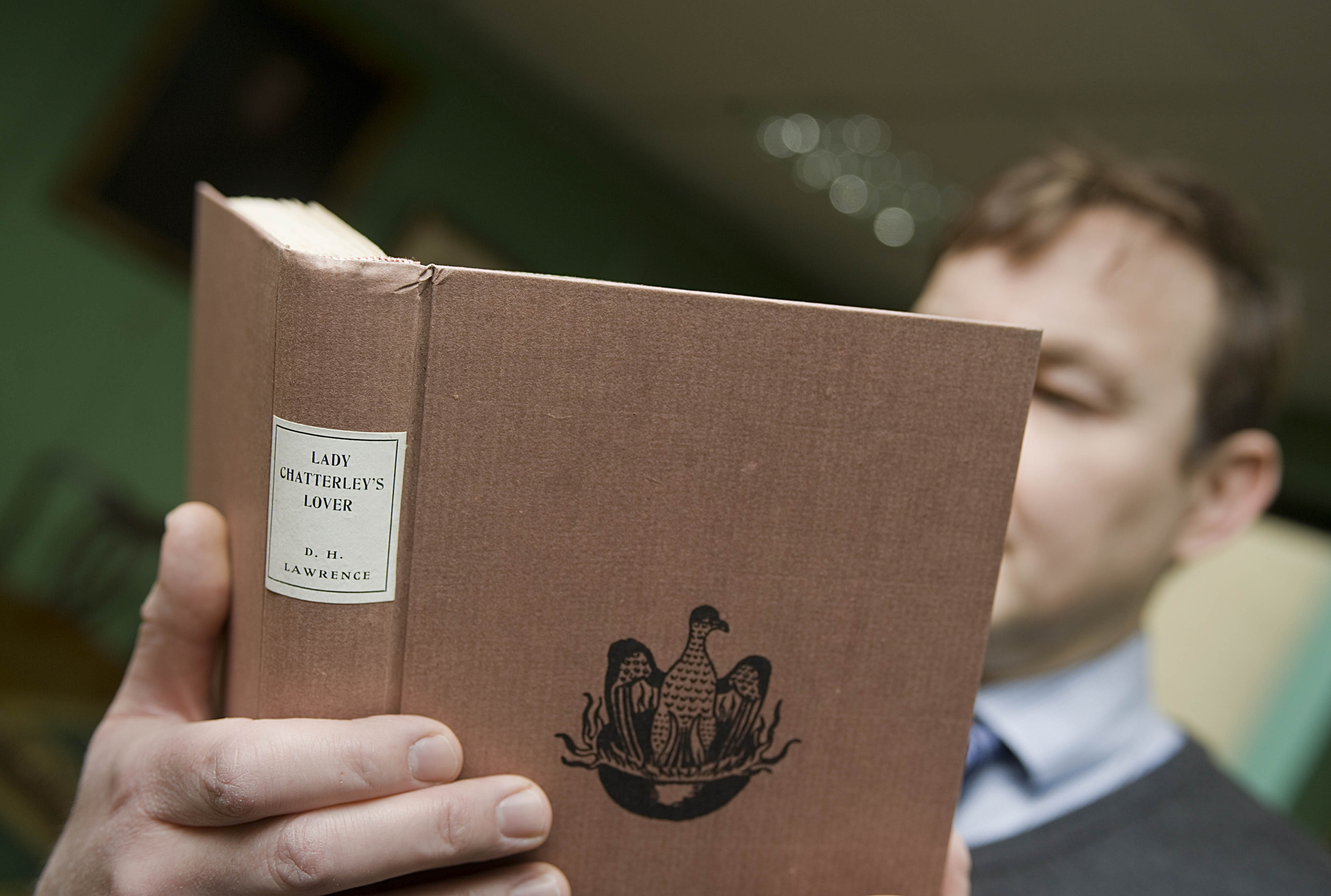 ©Si Barber. Moral rights asserted.   Auctioneer Charles Ashton of Cheffins, Cambridge examining a rare first edition of D H Lawrence's Lady Chatterley's lover which comes up for auction on Wednesday 23rd February 2011. Lawrence paid for the first printing of his infamous novel in 1928 undertaken by the Italian publisher Orioli when he was unable to find a British publisher for the work. There were only 1000 printed with each one being signed by Lawrence. This edition os expected to sell for ?2500. Lady Chatterley's lover was eventually sold publically in the UK in 1960 after a celebrated courtcase.