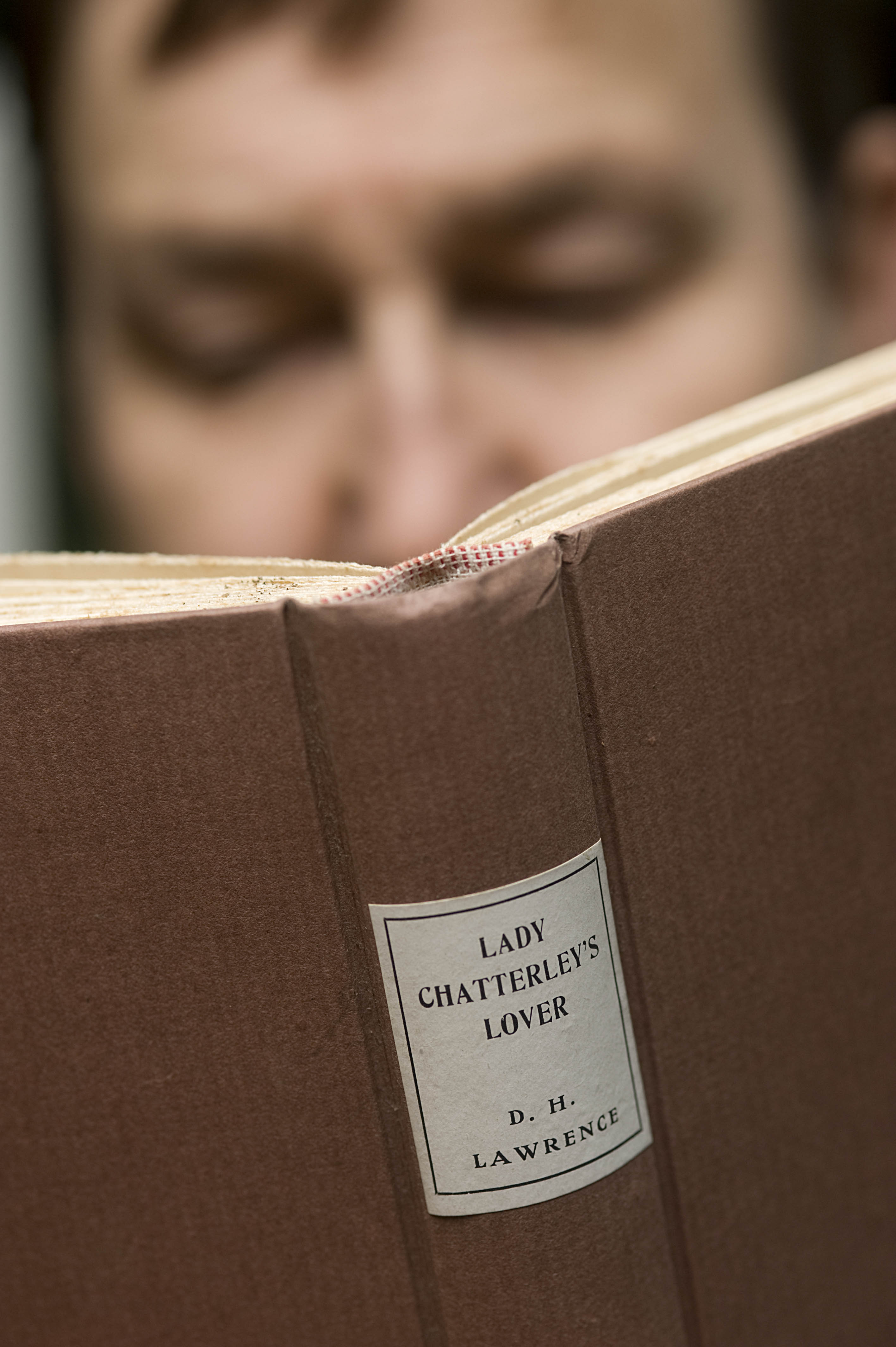 ©Si Barber. Moral rights asserted.   Auctioneer Charles Ashton of Cheffins, Cambridge examining a rare first edition of D H Lawrence's Lady Chatterley's lover which comes up for auction on Wednesday 23rd February 2011. Lawrence paid for the first printing of his infamous novel in 1928 undertaken by the Italian publisher Orioli when he was unable to find a British publisher for the work. There were only 1000 printed with each one being signed by Lawrence. This edition os expected to sell for ?2500. Lady Chatterley's lover was eventually sold publically in the UK in 1960 after a celebrated courtcase.