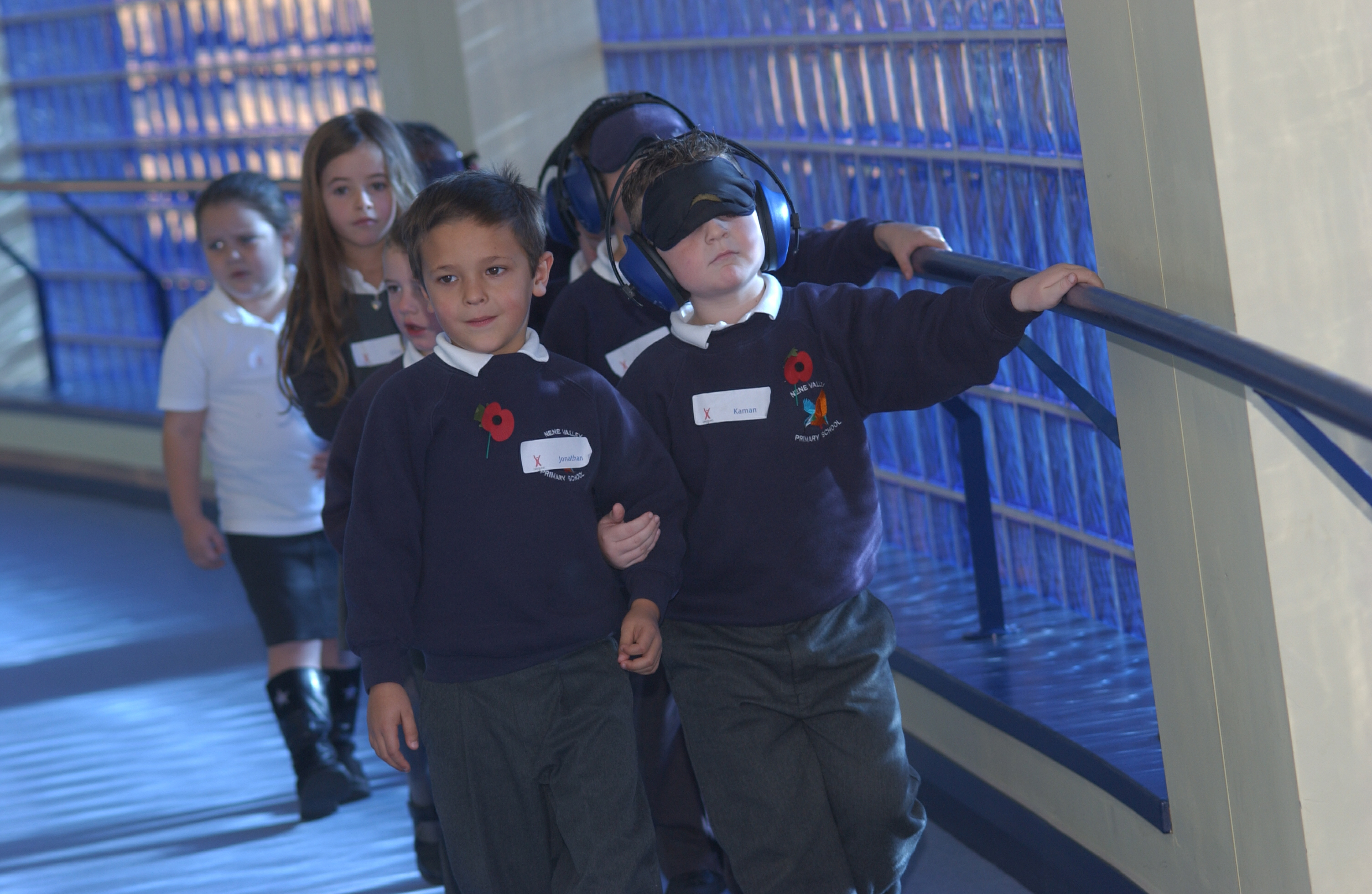 Primary school children experiencing the world of deaf and blind people at the Royal National Institute for the Blind in Peterborough.