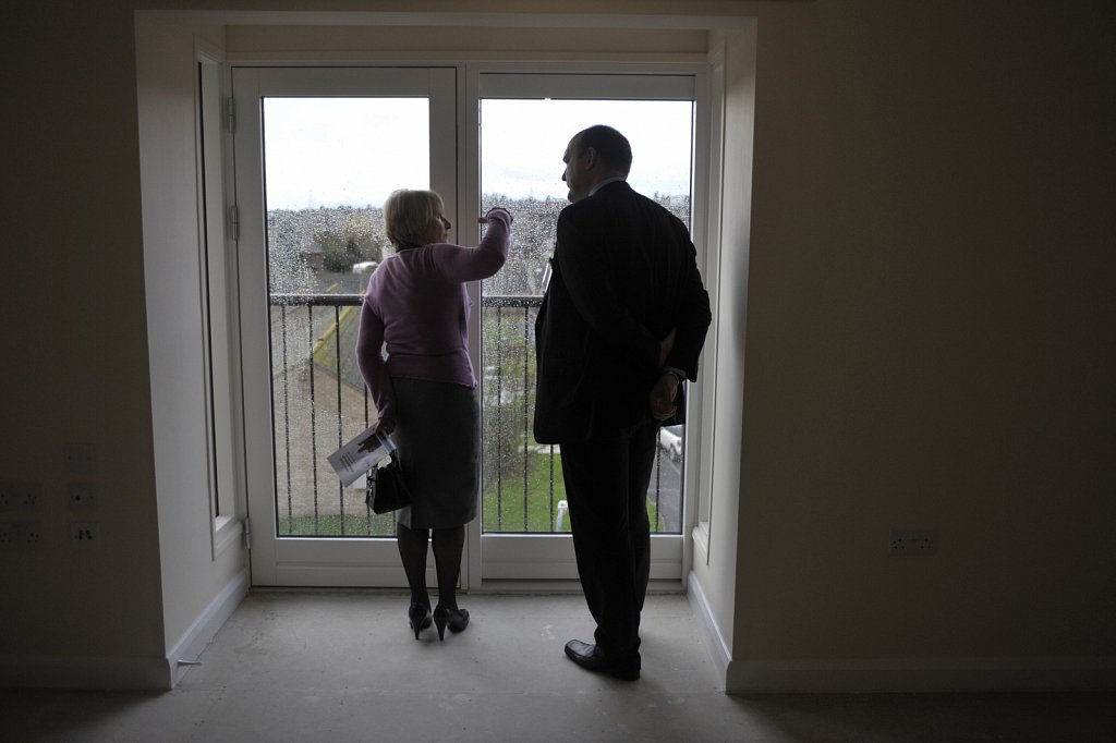 Estate agent showing a prospective buyer around a new build property.
