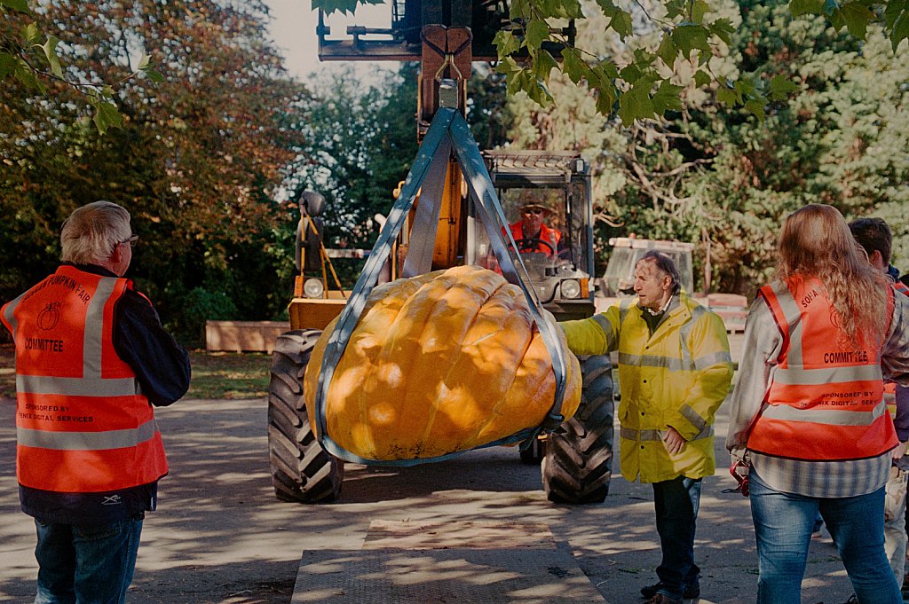 A forklift is used to lift pumpkins for weighing before judges at the 43rd Soham Pumpkin Fair, Cambs.