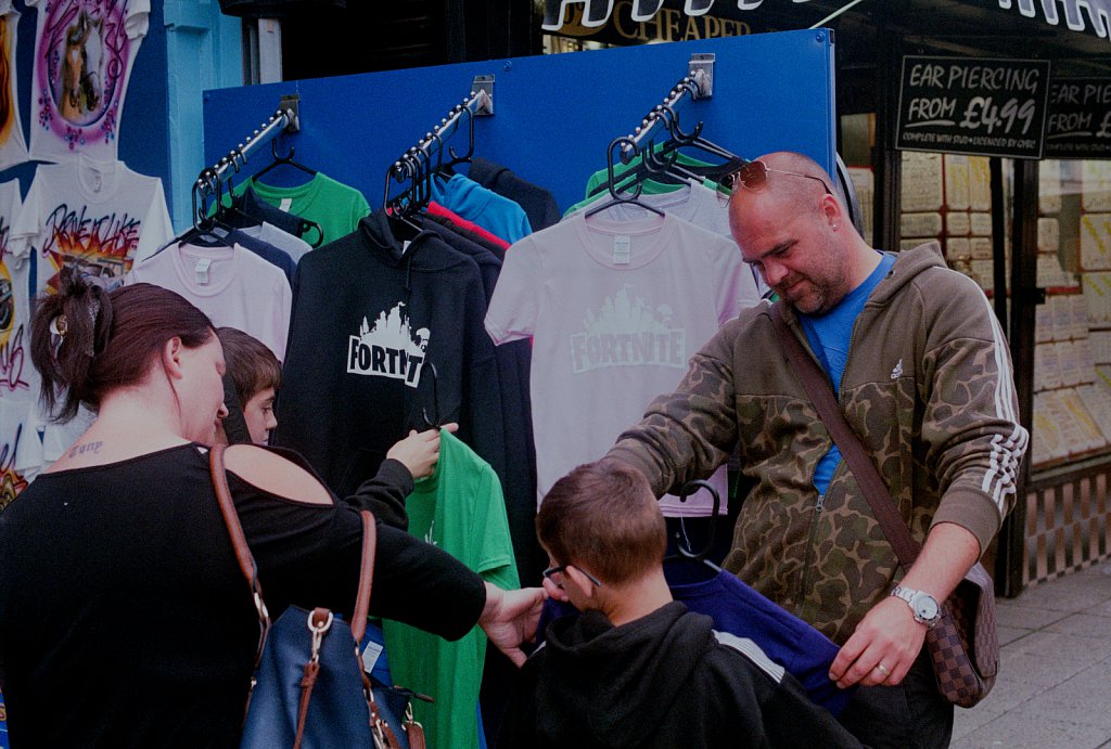 People buying Fortnite Tshirts in Great Yarmouth, Norfolk.