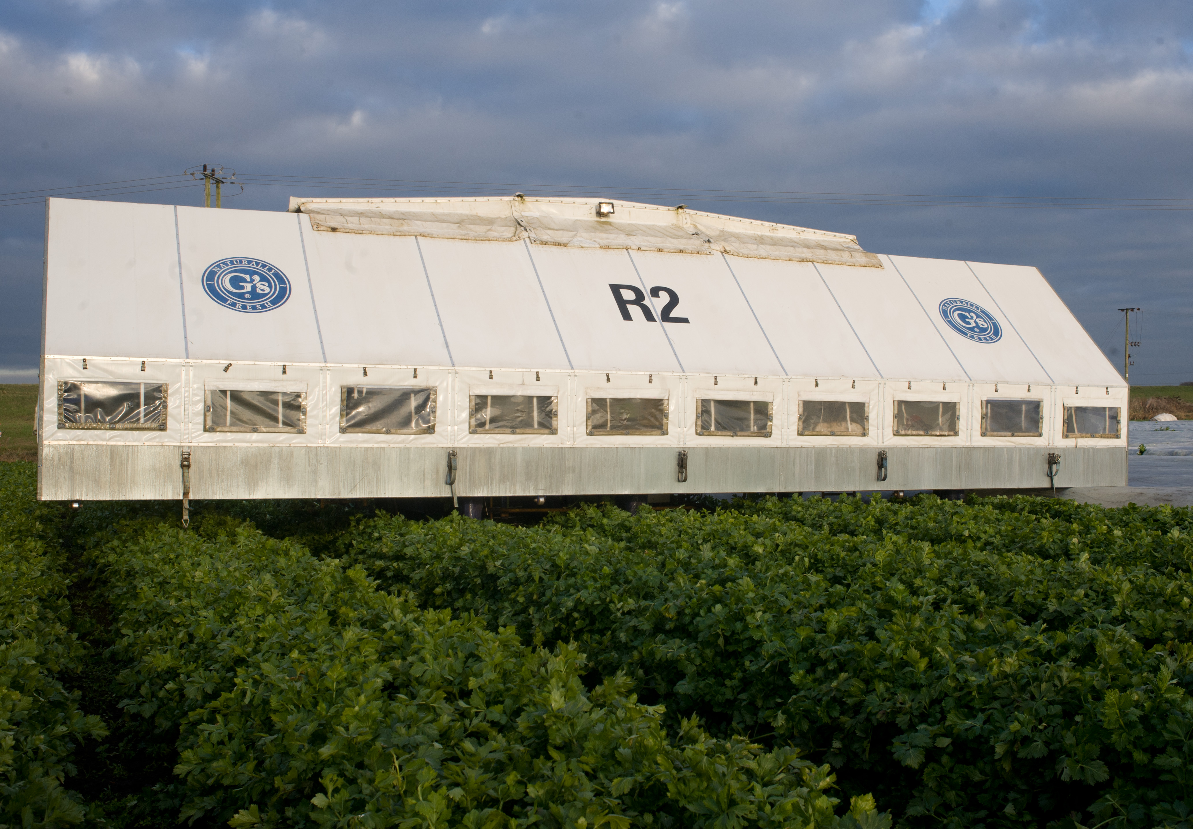 G's vegetable growers near Ely in Cambridgeshire. The company employs and provides accommodation and facilities for many workers from Eastern Europe. Picture shows - celerey being cut, processed and packed inside a rig in a field.