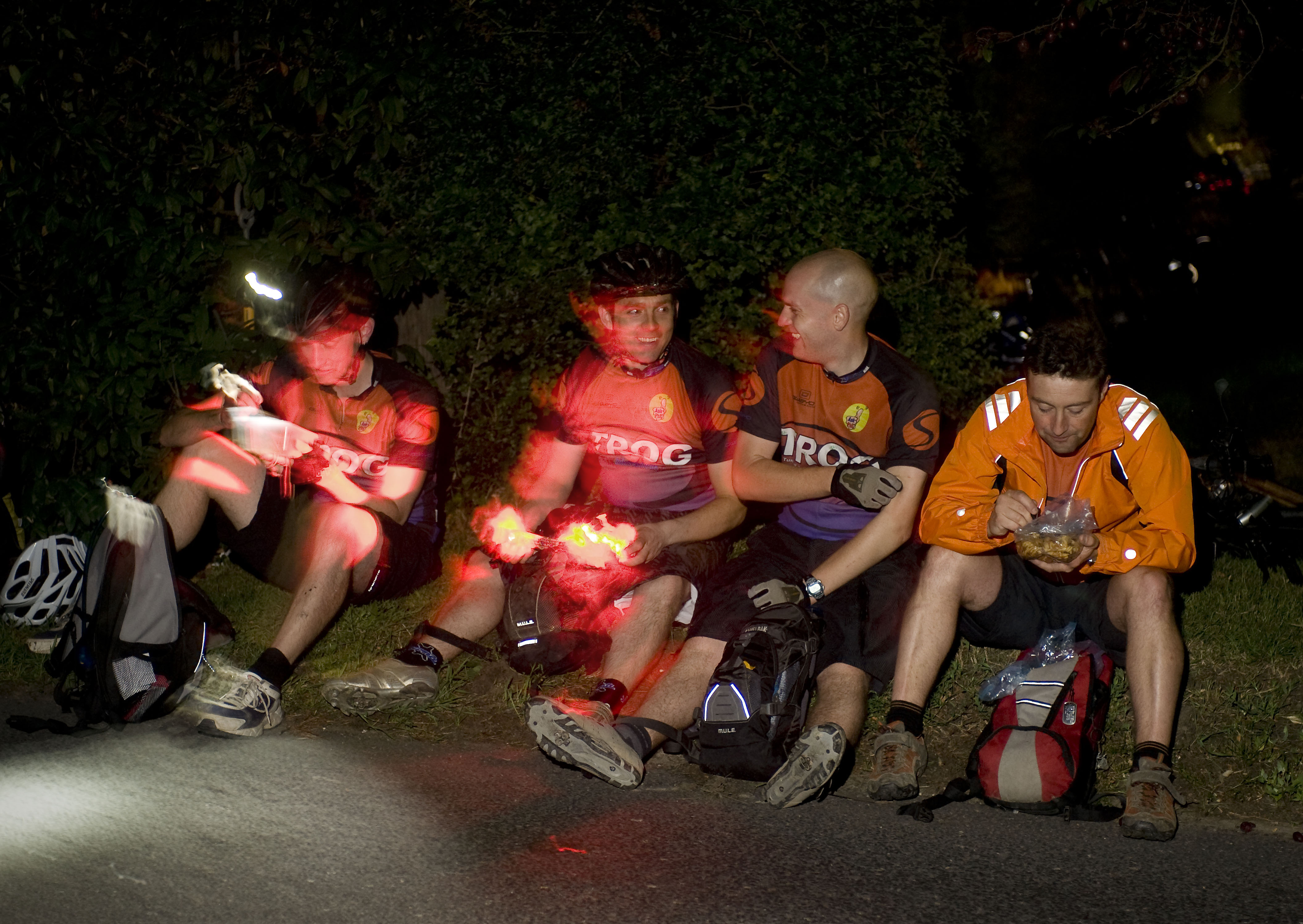 Si Barber 07739 472 922 Ordered by Leila Rawlins The Dunwich Dynamo cycle race in which competitors ride 120 mile route from London Fields to Dunwich in Suffolk overnight. Picture shows riders take a break by the side of the road.