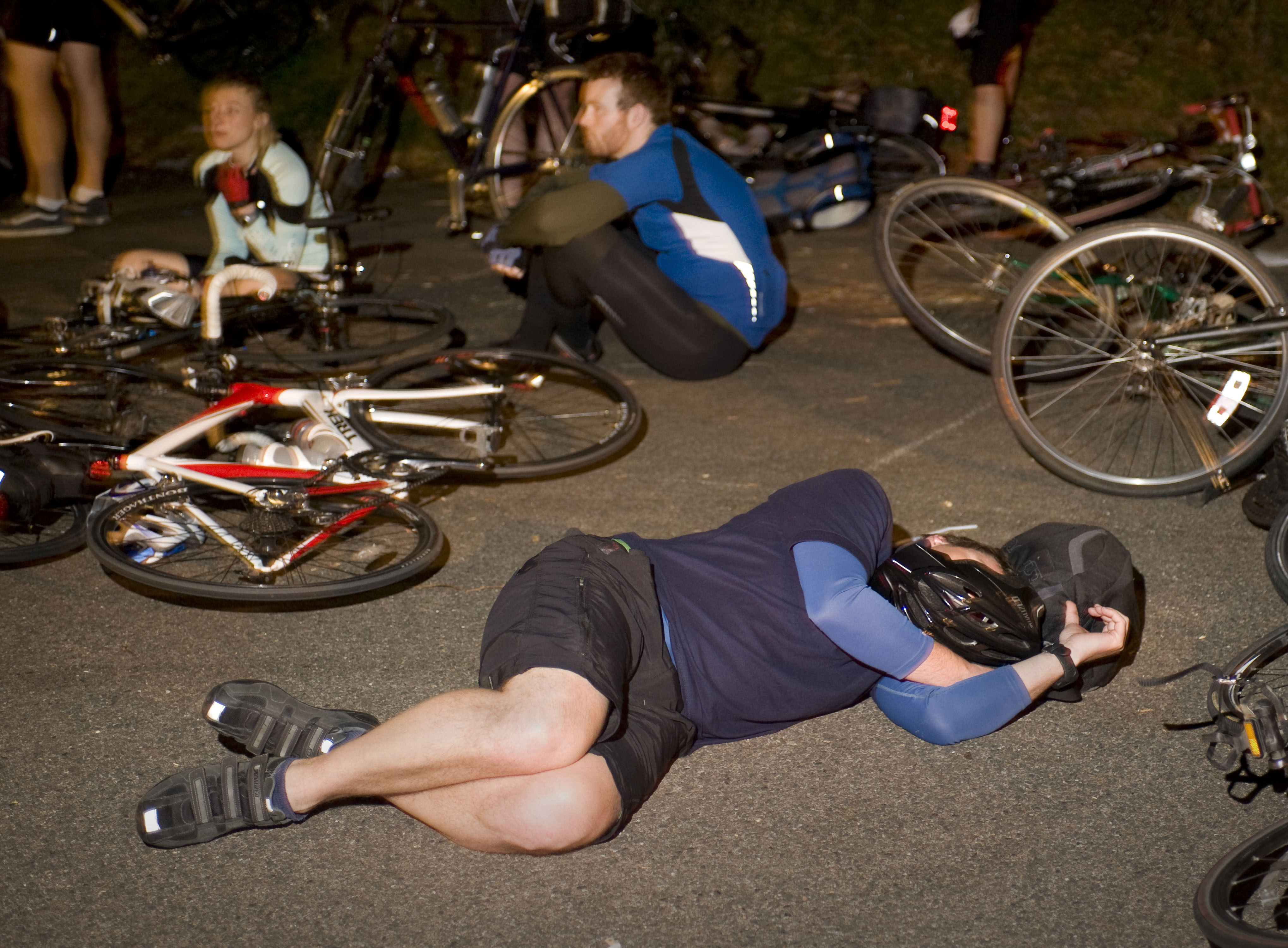 Si Barber 07739 472 922 Ordered by Leila Rawlins The Dunwich Dynamo cycle race in which competitors ride 120 mile route from London Fields to Dunwich in Suffolk overnight. Picture shows an exhausted cyclist outside the feeding station.