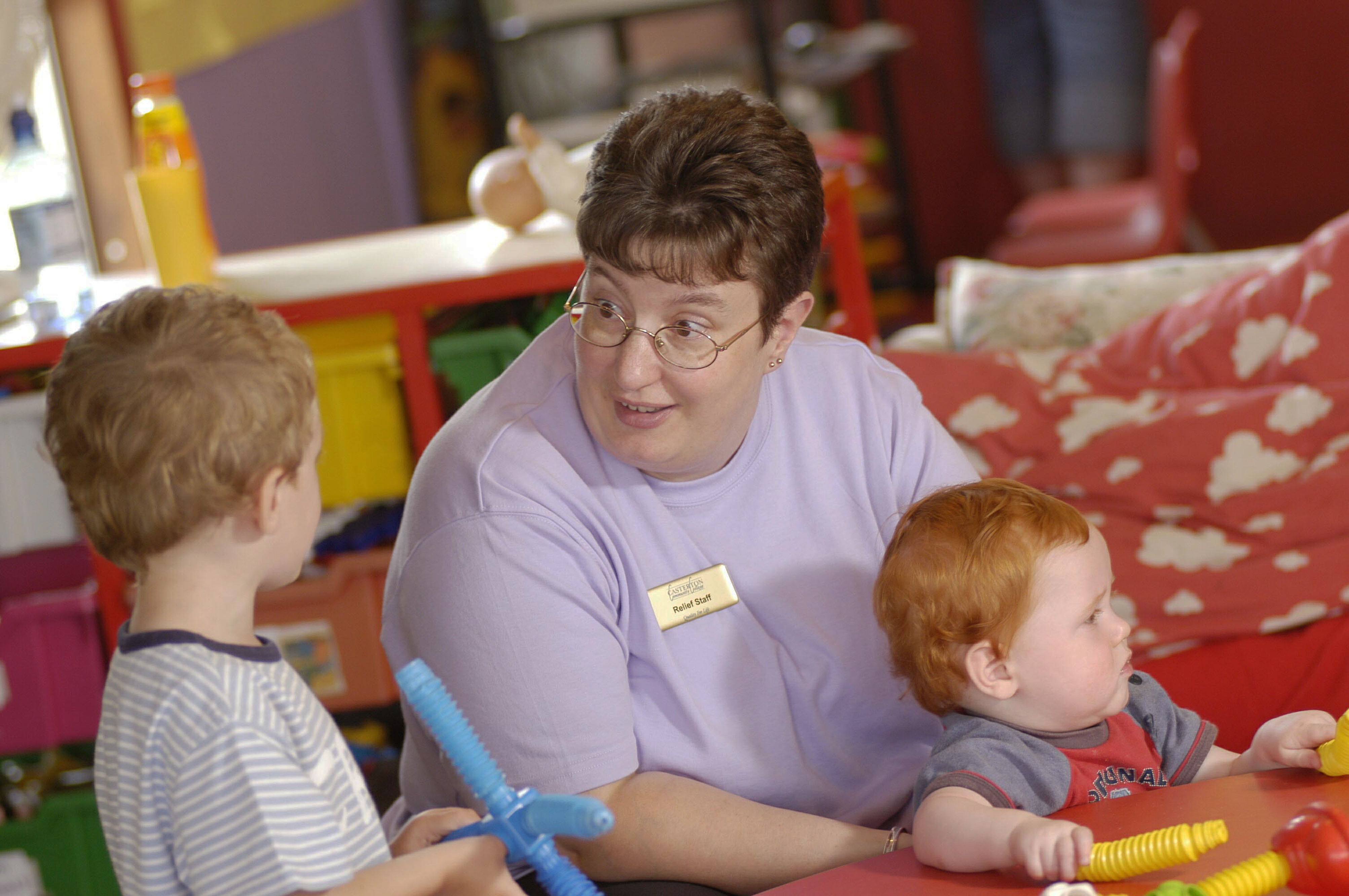 bonding care caring children employees kindergarten learn learning nursery play playgroup playing staff with workers working