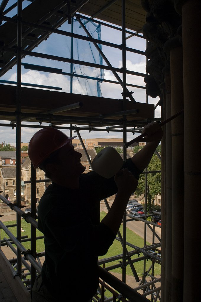 Mandatory Credit: ? Si Barber/07739 472 922 Stonemason working at height on Peterborough Cathedral