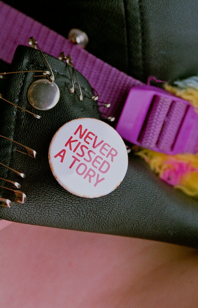 A young punk in Norwich waering badges declaiming her political allegiances.