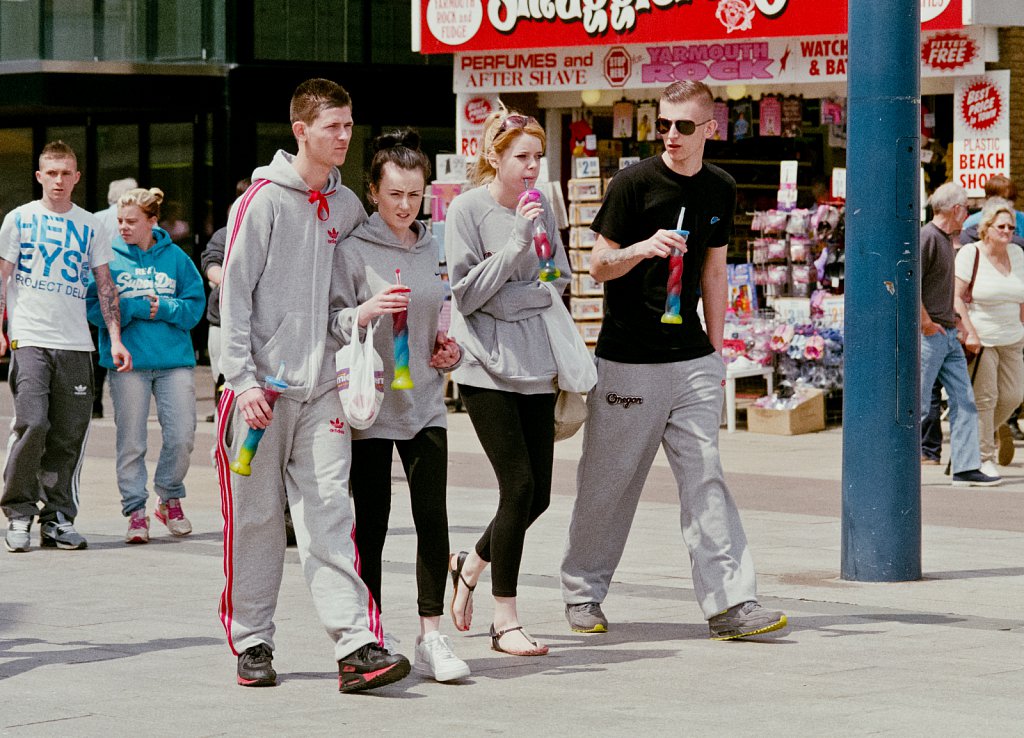 Adolescent boys and a girlhanging out in a town centre, Great Yarmouth, UK.