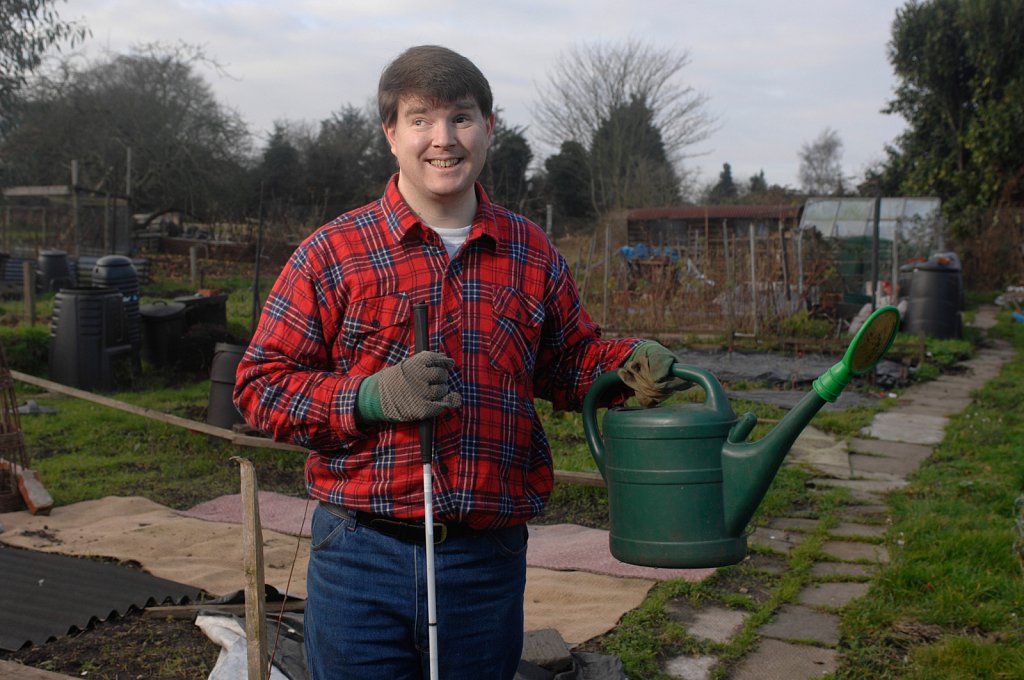 Mark Smith, blind gardener at work on his allotment in Norwich, Norfolk,UK.