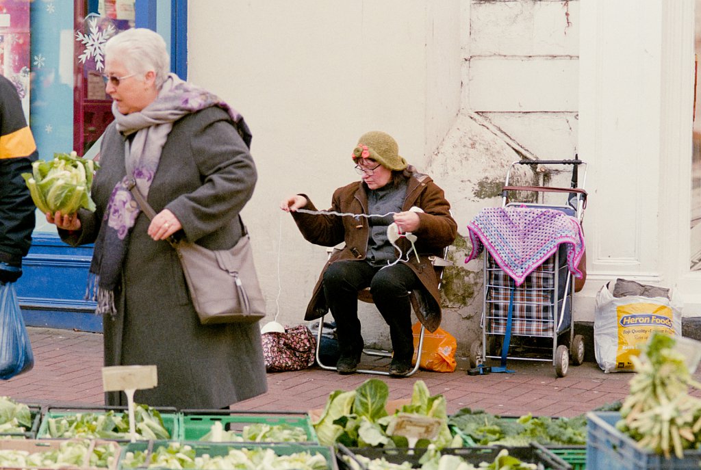 Woman knitting inSpalding market place, LIncolnshire, UK