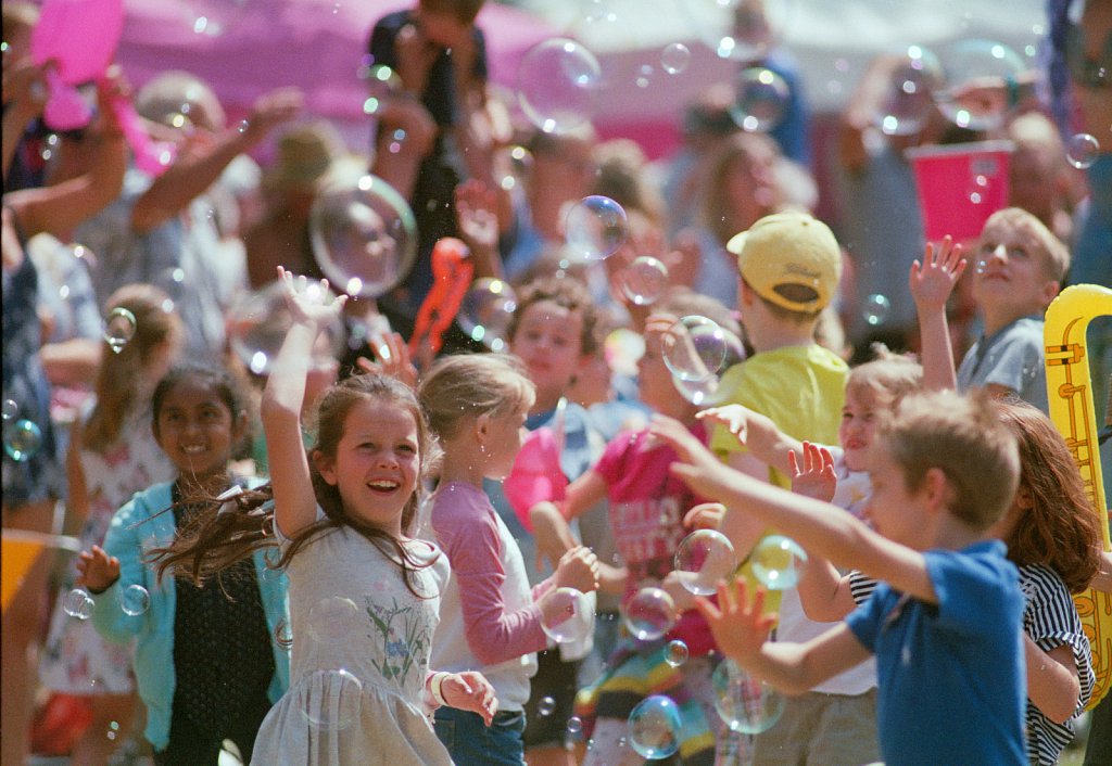 ©Si Barber. Moral rights asserted   Children playing with bubbles at Wells Carnival, Norfolk.
