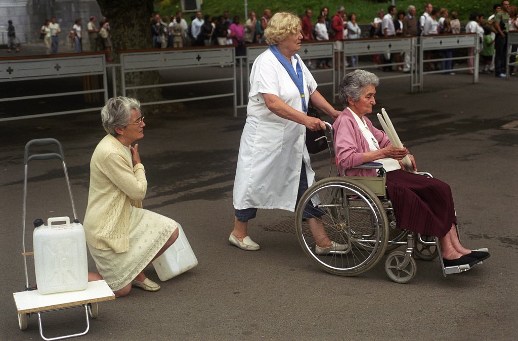 cure lourdes martyr pilgrimage pilgrims pray prayers wheelchair worshippers