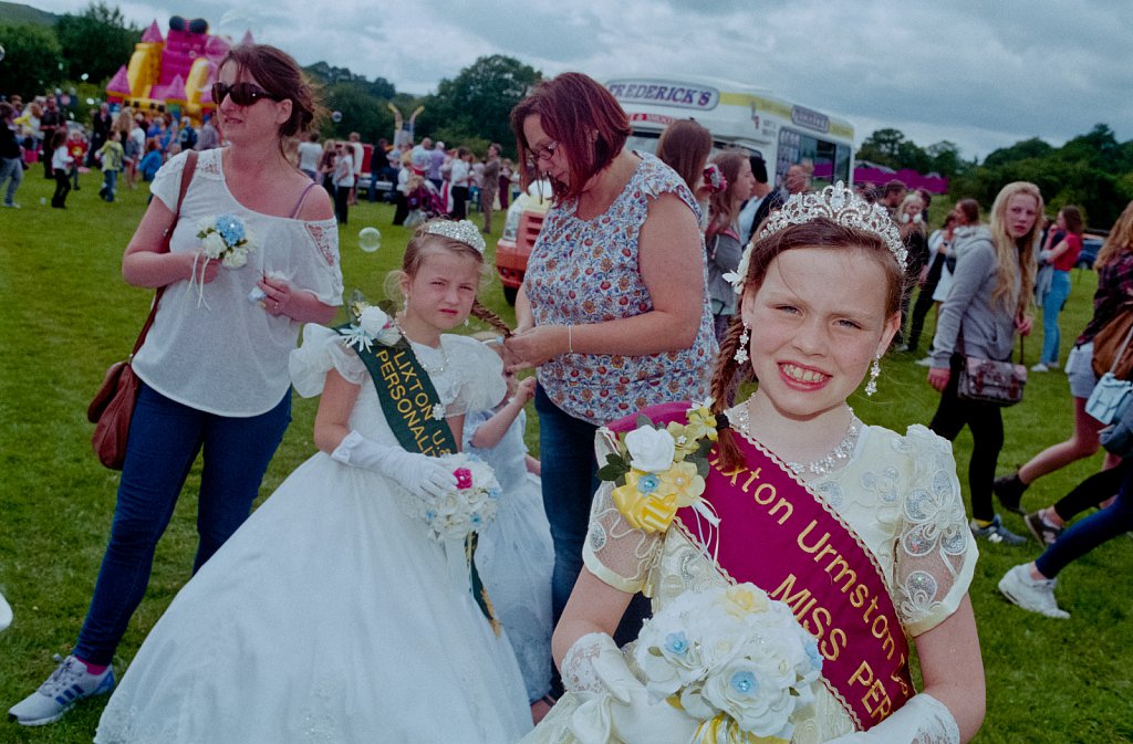 © Si Barber 07739 472 922 Village carnival queens being prepared and judged. Bamford, Derbyshire.