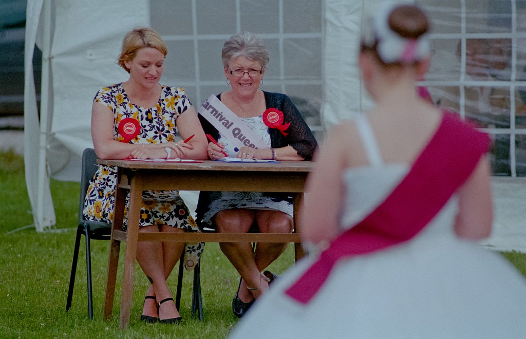 © Si Barber 07739 472 922 Village carnival queens being prepared and judged. Bamford, Derbyshire.
