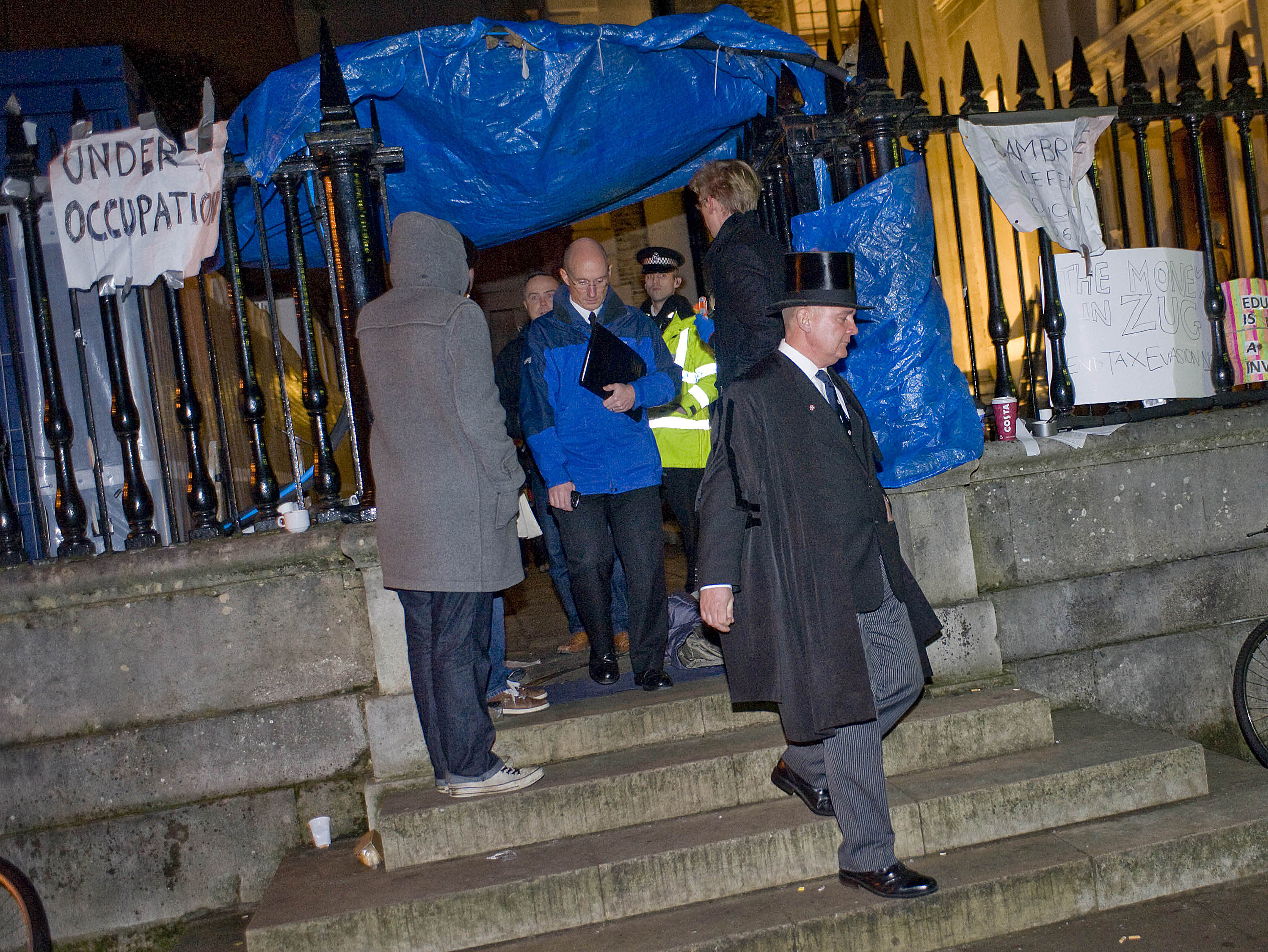 Cambridge Student Protests 2010   ©Si Barber. Moral rights Asserted. The university Marshall of Cambridge leaves the Senate House after serving an eviction notice on students who have been occupying the building to protest against higher education fees 3rd December 2010.