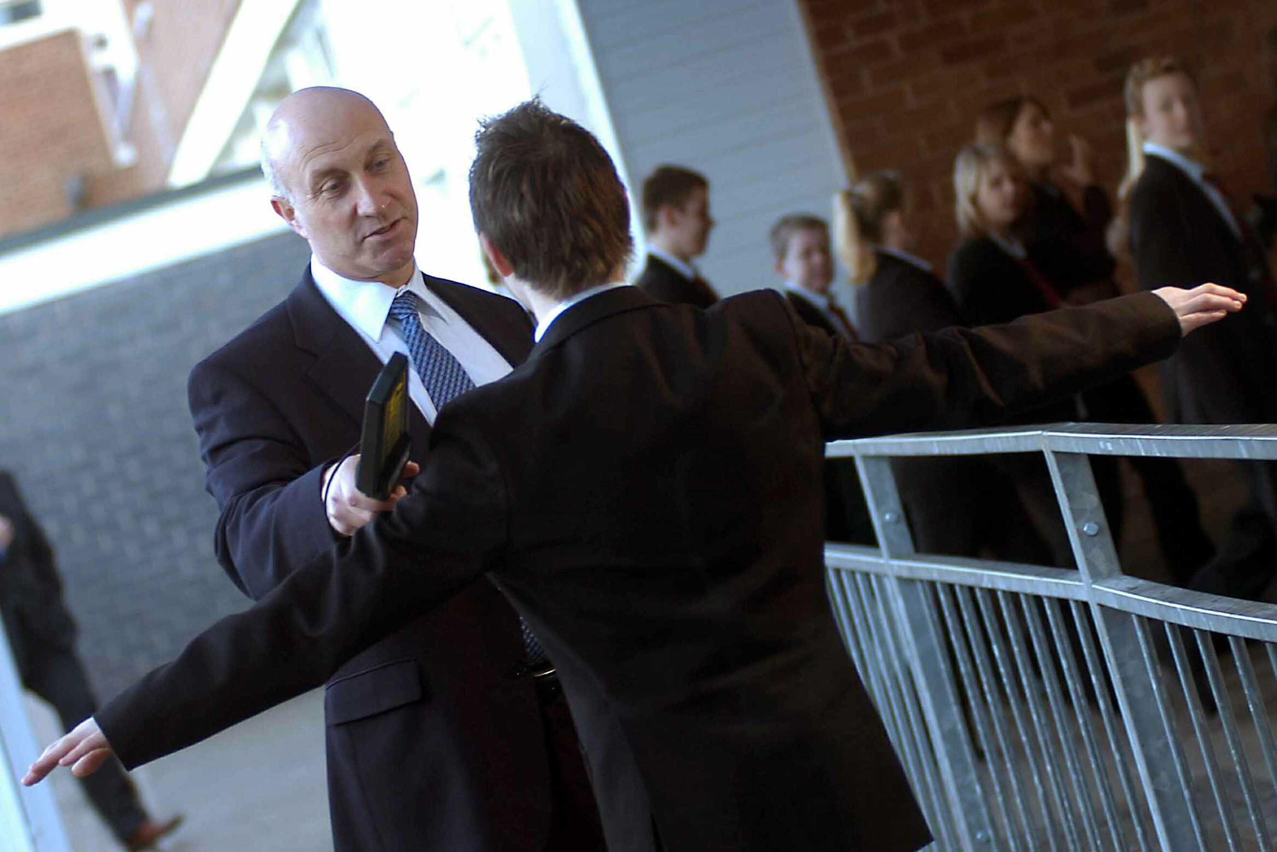 Principal David Hampson at Tollbar Business & Enterprise school using a handheld scanner to check pupils for weapons.