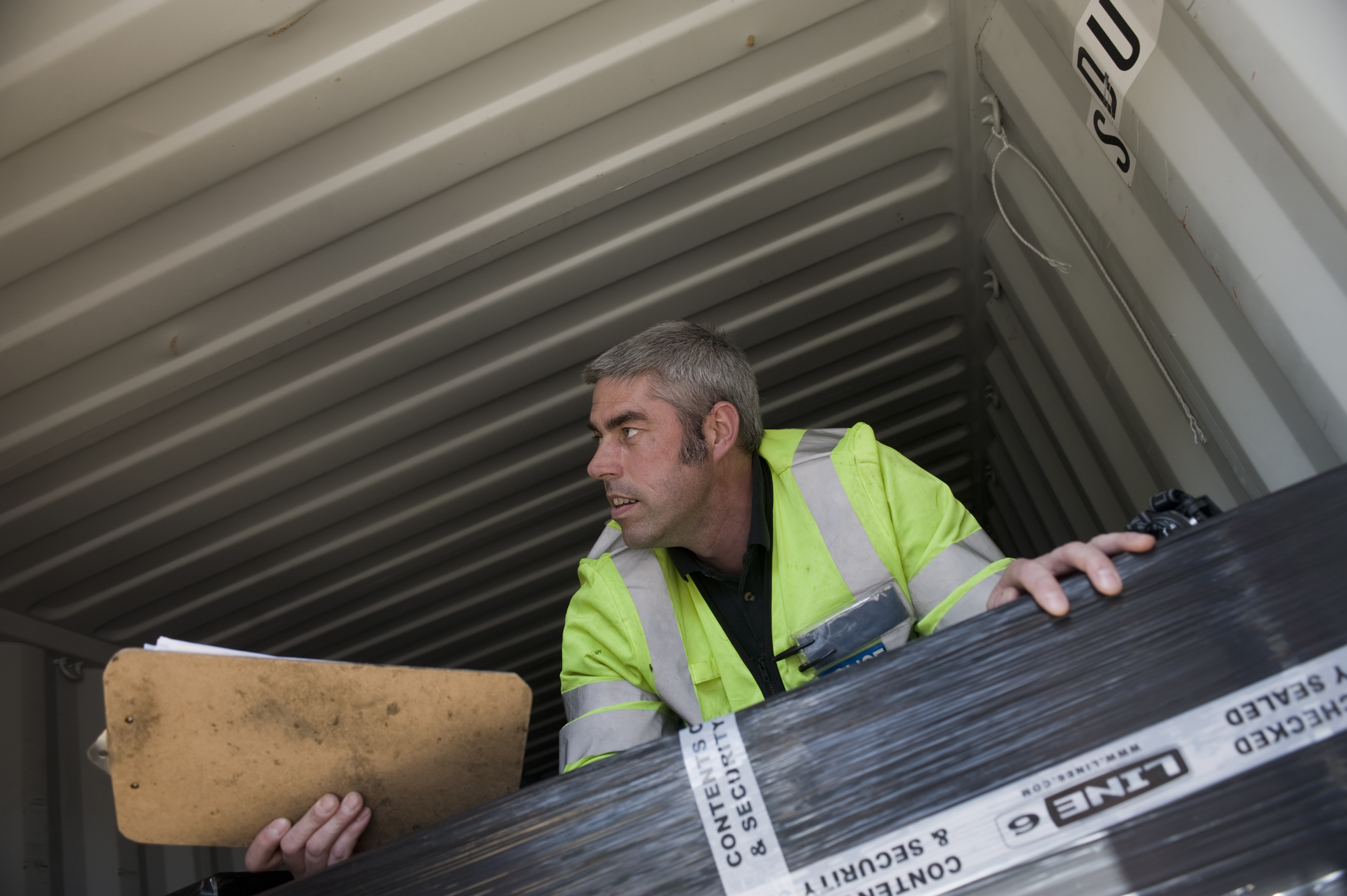 Police officers searching containers at Felixstowe port in Suffolk for stolen goods and contraband.