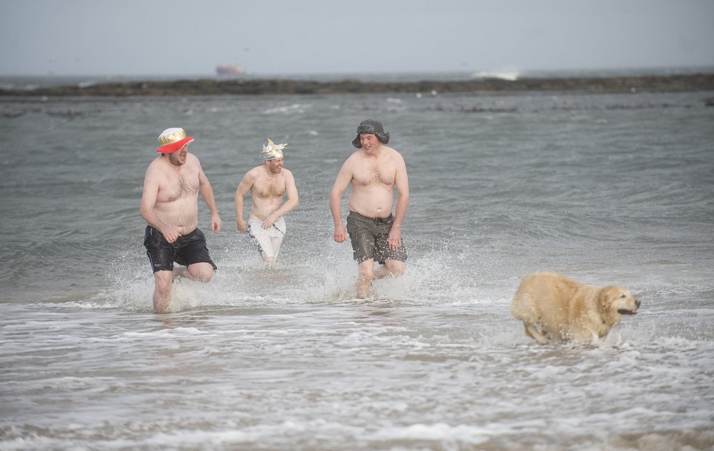 Image by Si Barber   Three men going for a boxing day swim on Recar beach, North Yorkshire,UK.
