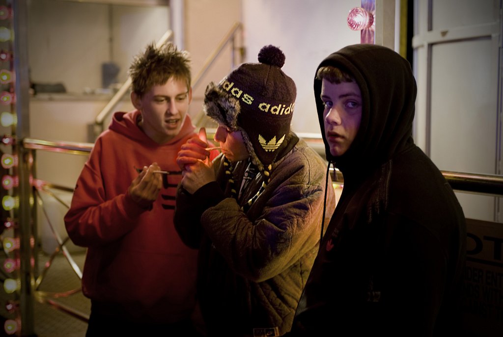 Teenagers share a light at King's Lynn Mart, Norfolk.