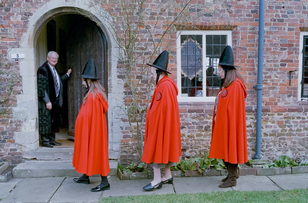 ©Si Barber. Moral rights asserted   Residents of Trinity Hospital Almshouses assemble before the Clerk to the Trustees on Founders Day. The almshouses in Castle Rising, Norfolk, have offered permanent accommodation to destitute spinsters and widows of the parish since 1614 provided they 'are  religious, grave, discreet and no beggar, harlot, scold drunkard or haunter of taverns”.